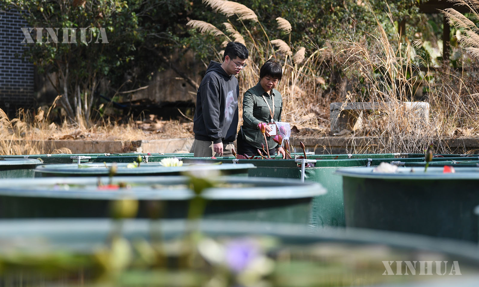 တရုတ်နိုင်ငံ ကွမ်တုန်းပြည်နယ် ကွမ်ကျိုးမြို့ ယွိရှီးရုက္ခဗေဒဥယျာဉ်ရှိ ကြာပန်းသရုပ်ပြဇုန်တွင် ဝန်ထမ်းက ကြာပန်းအား မြေဩဇာထည့်ပေးနေသည်ကို ၂၀၂၆ ခုနှစ် ဇန်နဝါရီ ၂၇ ရက်က တွေ့ရစဉ် (ဆင်ဟွာ)
