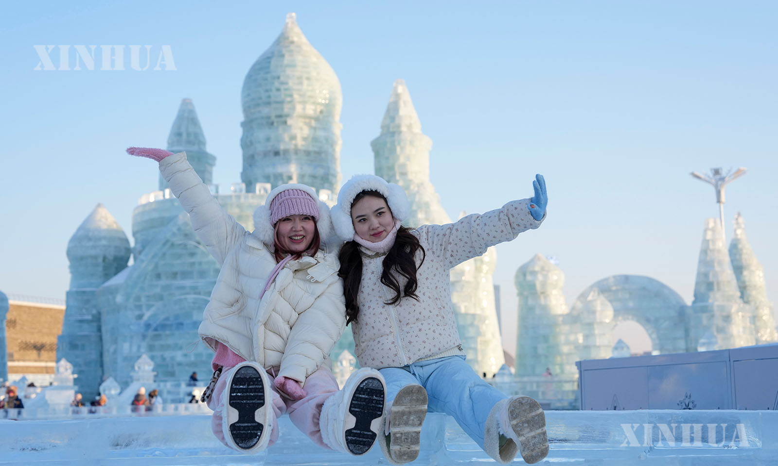 1、1月5日,游客在哈尔滨冰雪大世界园区游玩、拍照。 新华社记者 王建威 摄