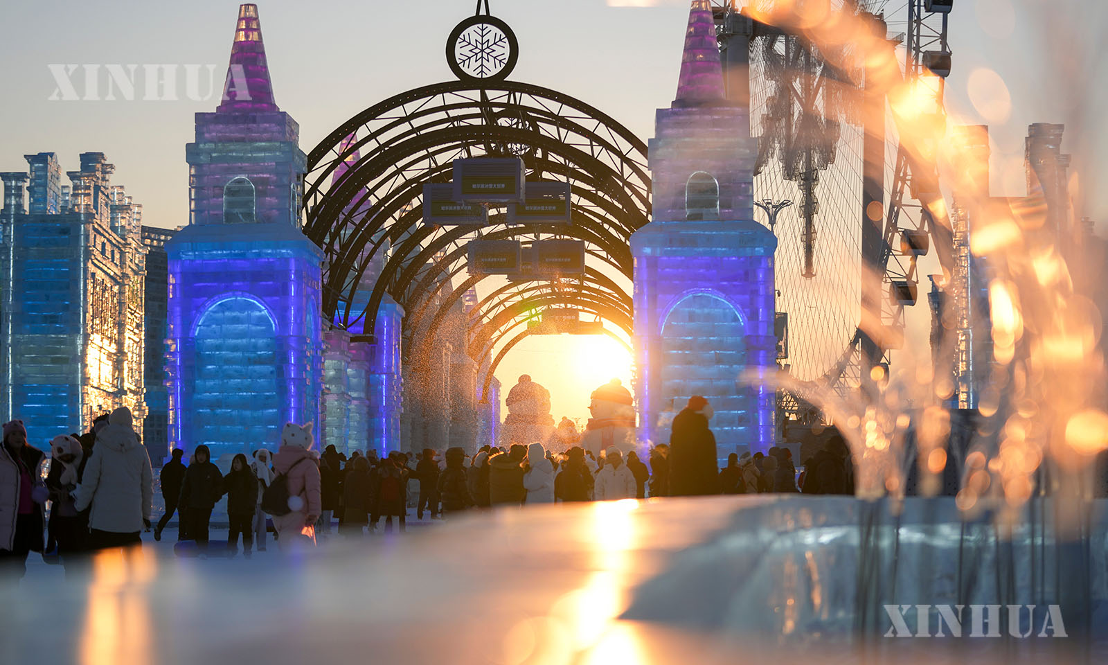 1、1月5日,游客在哈尔滨冰雪大世界园区游玩、拍照。 新华社记者 王建威 摄