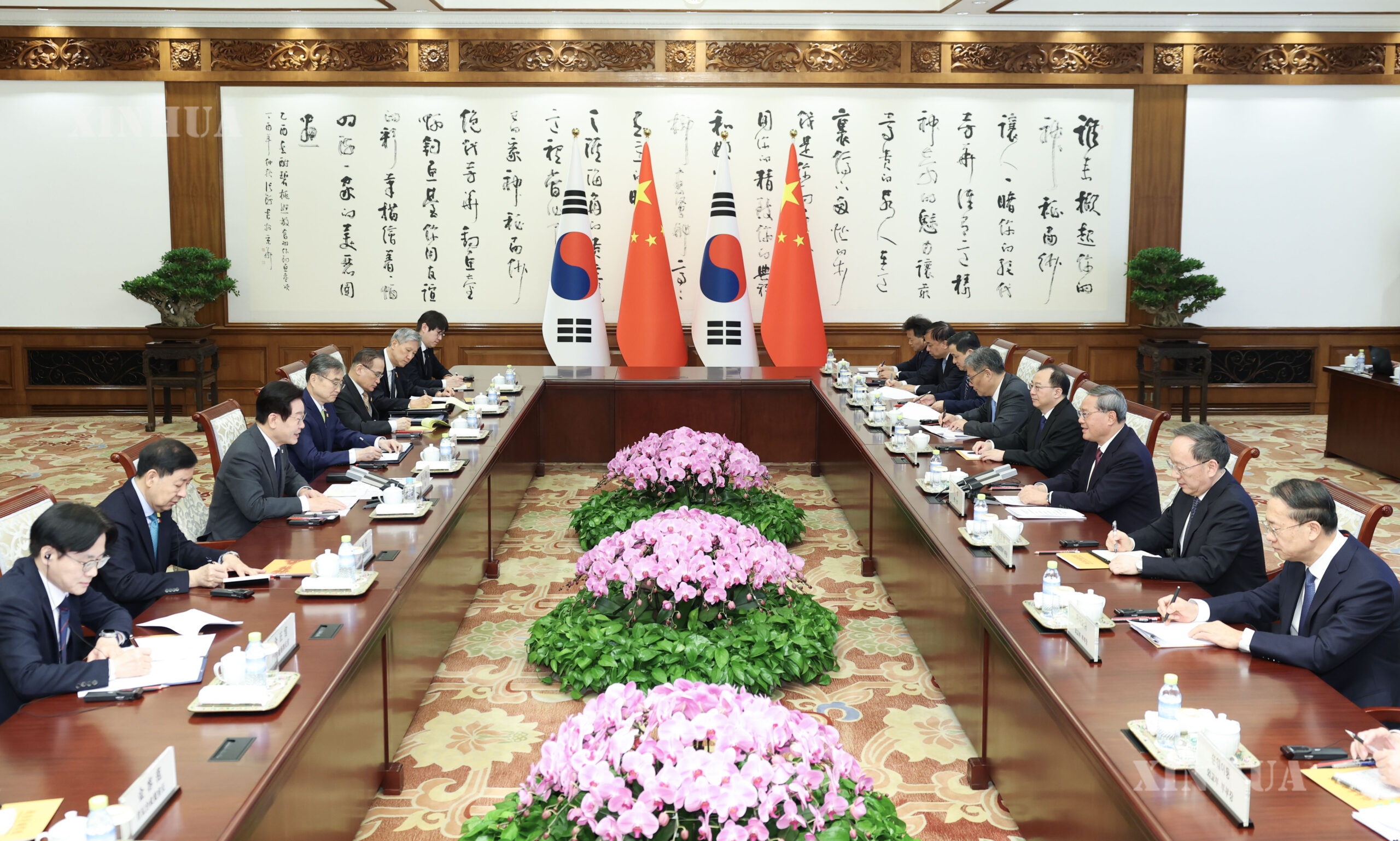 တရုတ်နိုင်ငံ ပေကျင်းမြို့ တျောက်ယွီထိုင် နိုင်ငံတော်ဧည့်ဂေဟာ၌ တရုတ်နိုင်ငံ နိုင်ငံတော်ကောင်စီ ဝန်ကြီးချုပ် လီချန်နှင့် တရုတ်နိုင်ငံသို့ နိုင်ငံတော်ခရီးစဉ် လာရောက်လျက်ရှိသည့် တောင်ကိုရီးယားနိုင်ငံ သမ္မတ လီဂျေမြောင်တို့ ၂၀၂၆ ခုနှစ် ဇန်နဝါရီ ၆ ရက် နံနက်ပိုင်းတွင် တွေ့ဆုံဆွေးနွေးစဉ် (ဆင်ဟွာ)