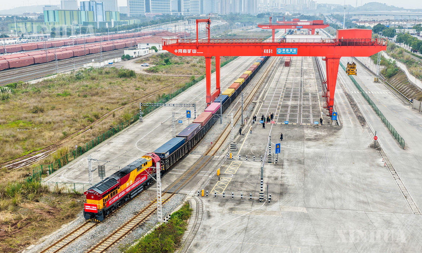2、1月7日,铁海联运“重庆造”新能源汽车专列在重庆果园港鱼嘴站顺利发车(无人机照片)。新华社记者 唐奕 摄