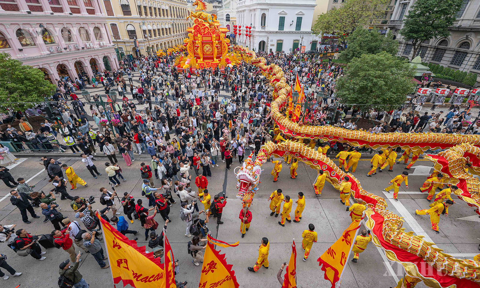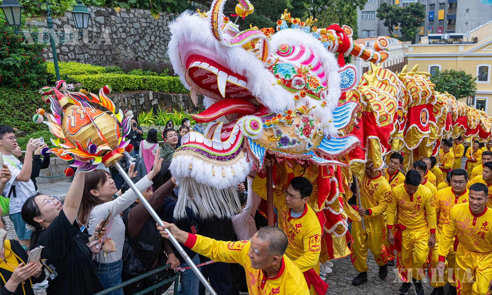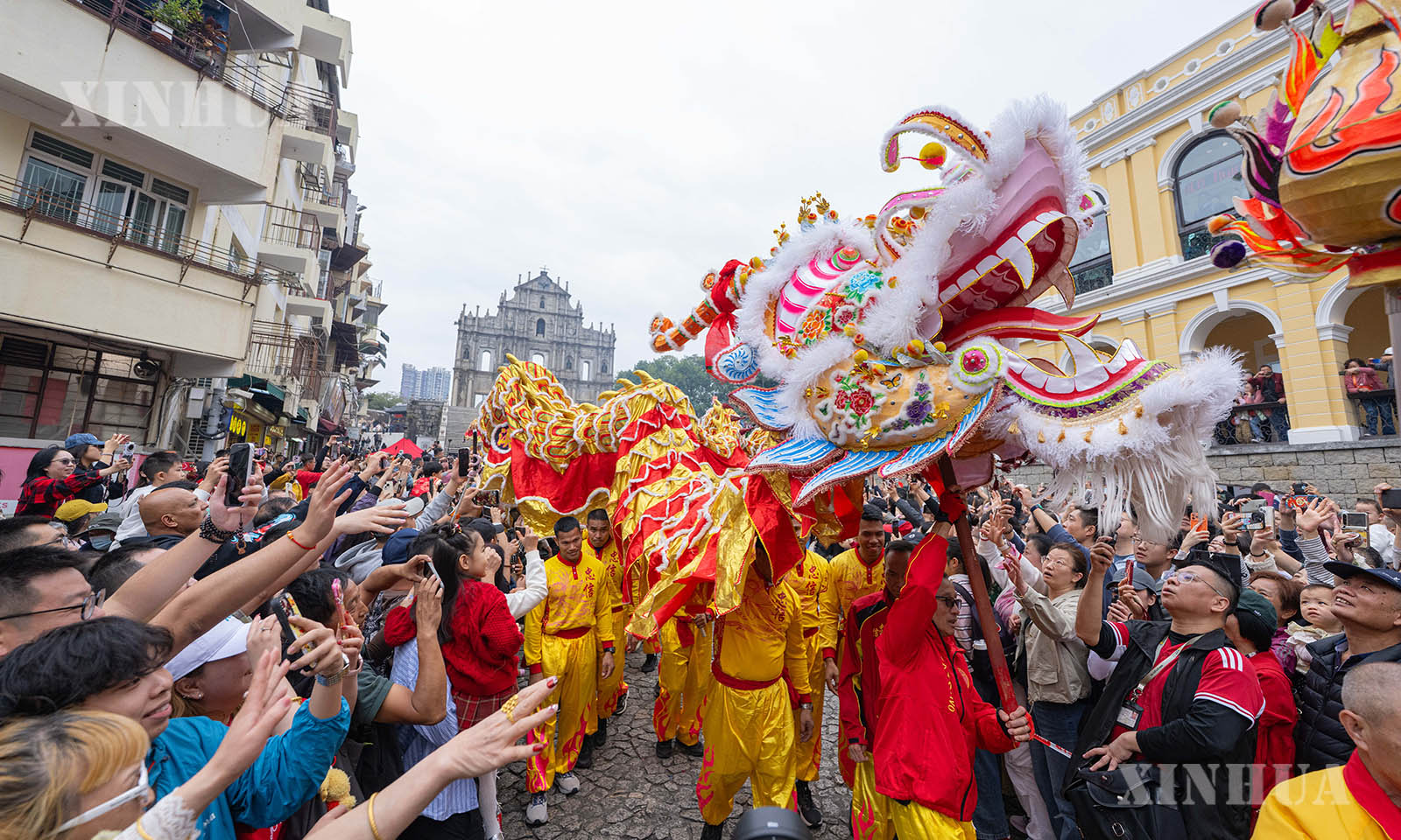 农历大年初一,澳门特区旅游局在大三巴牌坊及议事亭前地举办“欢乐春节——2026年龙腾舞跃贺新春”社区巡演活动,并安排长238米的大金龙在澳门多个主要景区巡游,营造浓浓节日氛围。 1. 2月17日,舞龙队伍在澳门大三巴牌坊前地表演。新华社发(张金加摄)