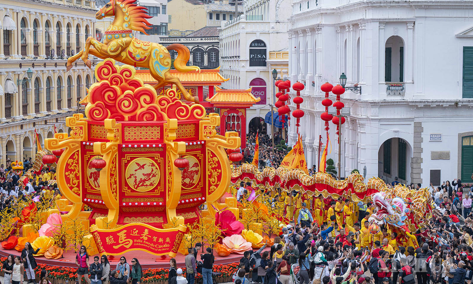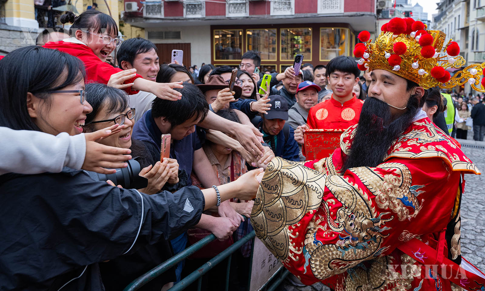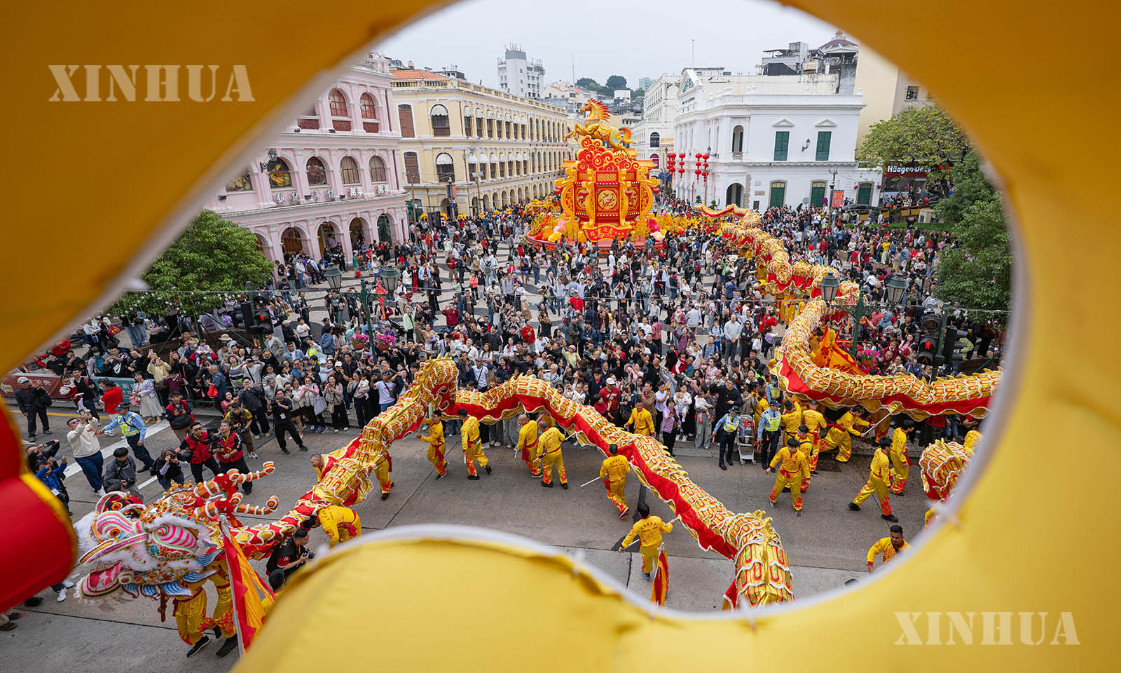 တရုတ်ပြက္ခဒိန် နှစ်ဆန်းတစ်ရက်နေ့တွင် မကာအို အထူးအုပ်ချုပ်ခွင့်ရဒေသ ခရီးသွားလုပ်ငန်းရုံးက စိန်ပေါလ်ဘုရားကျောင်းပျက်နှင့် စီနိုဒိုရင်ပြင်ရှေ့တွင် “ပျော်ရွှင်ဖွယ်နွေဦးပွဲတော်- ၂၀၂၆ ခုနှစ် နဂါးအကဖြင့် နှစ်သစ်ကူးနွေဦးပွဲတော် ကြိုဆိုခြင်း” လှည့်လည်ဖျော်ဖြေပွဲလှုပ်ရှားမှုများ ပြုလုပ်ခဲ့သည်။ ၂၃၈ မီတာ ရှည်လျားသော ရွှေနဂါးကြီးသည် မကာအို အဓိက ရှုခင်းသာခရီးသွားနေရာများသို့ လှည့်လည်ဖျော်ဖြေကြရာ ပွဲတော်အငွေ့အသက်များ ကြိုင်လှိုင်ခဲ့သည်။ (Xinhua)