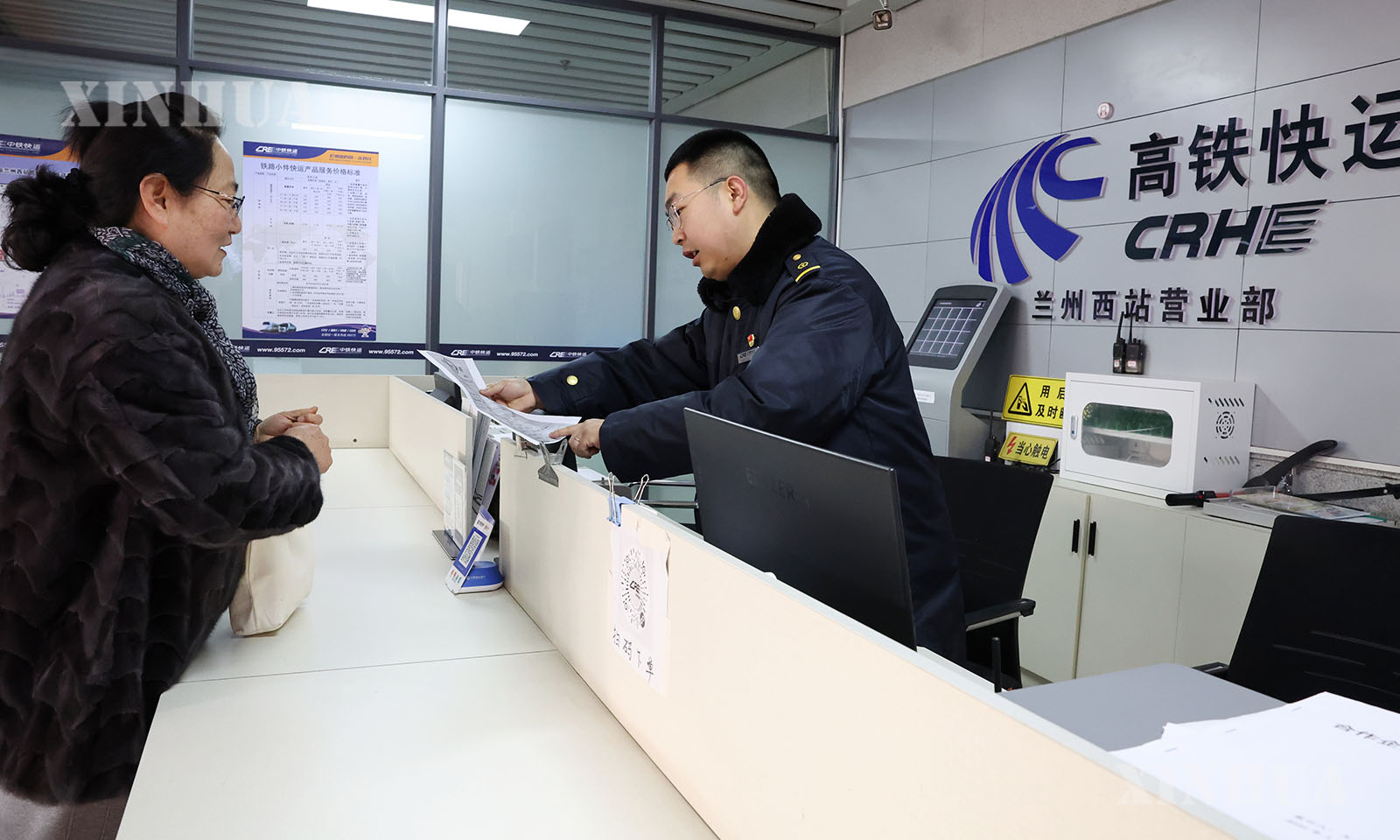图说1:2月1日,中铁快运兰州西站营业部工作人员孙谦(右)为旅客董文琦办理宠物托运手续。 新华社记者 陈斌 摄