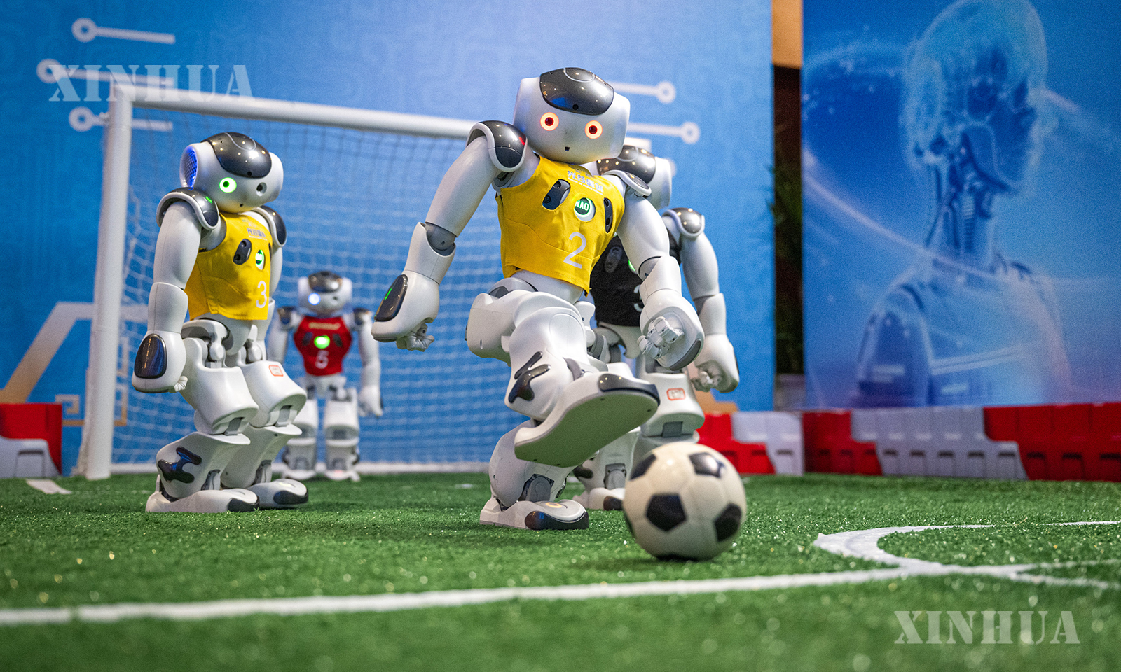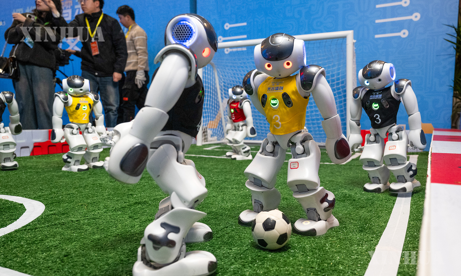 图说2:2月24日,人形机器人在现场表演踢足球。新华社记者 肖艺九 摄