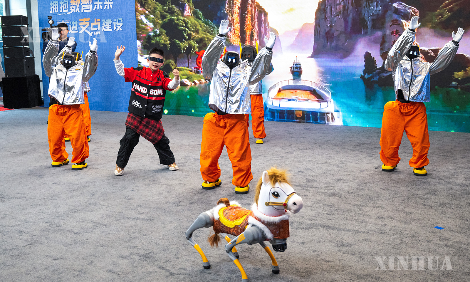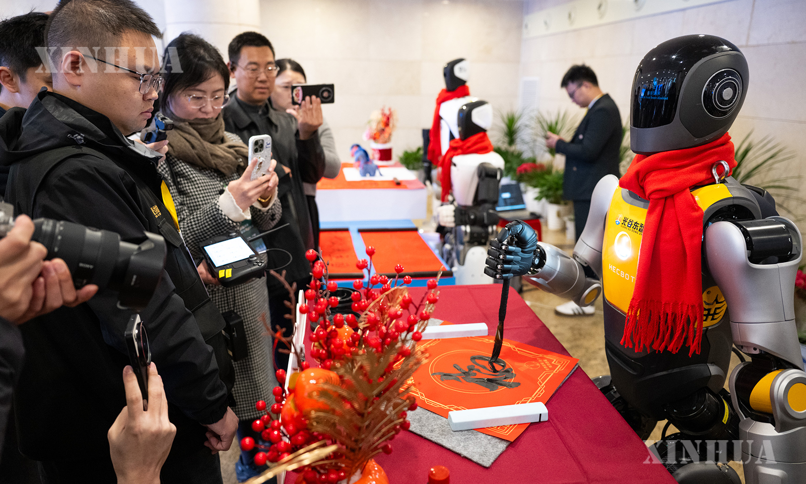 ပြပွဲနေရာတွင် လူပုံစံတူစက်ရုပ်များ ဘောလုံးကန် ဖျော်ဖြေနေသည်ကို ၂၀၂၆ ခုနှစ် ဖေဖော်ဝါရီ ၂၄ ရက်တွင် တွေ့ရစဉ် (ဆင်ဟွာ)