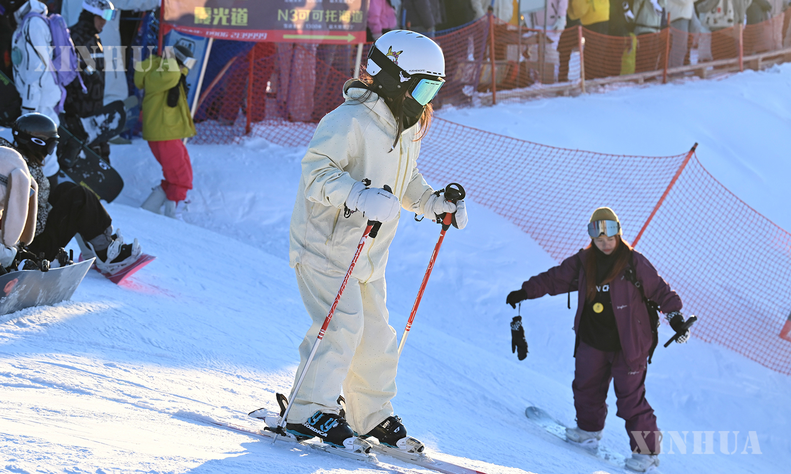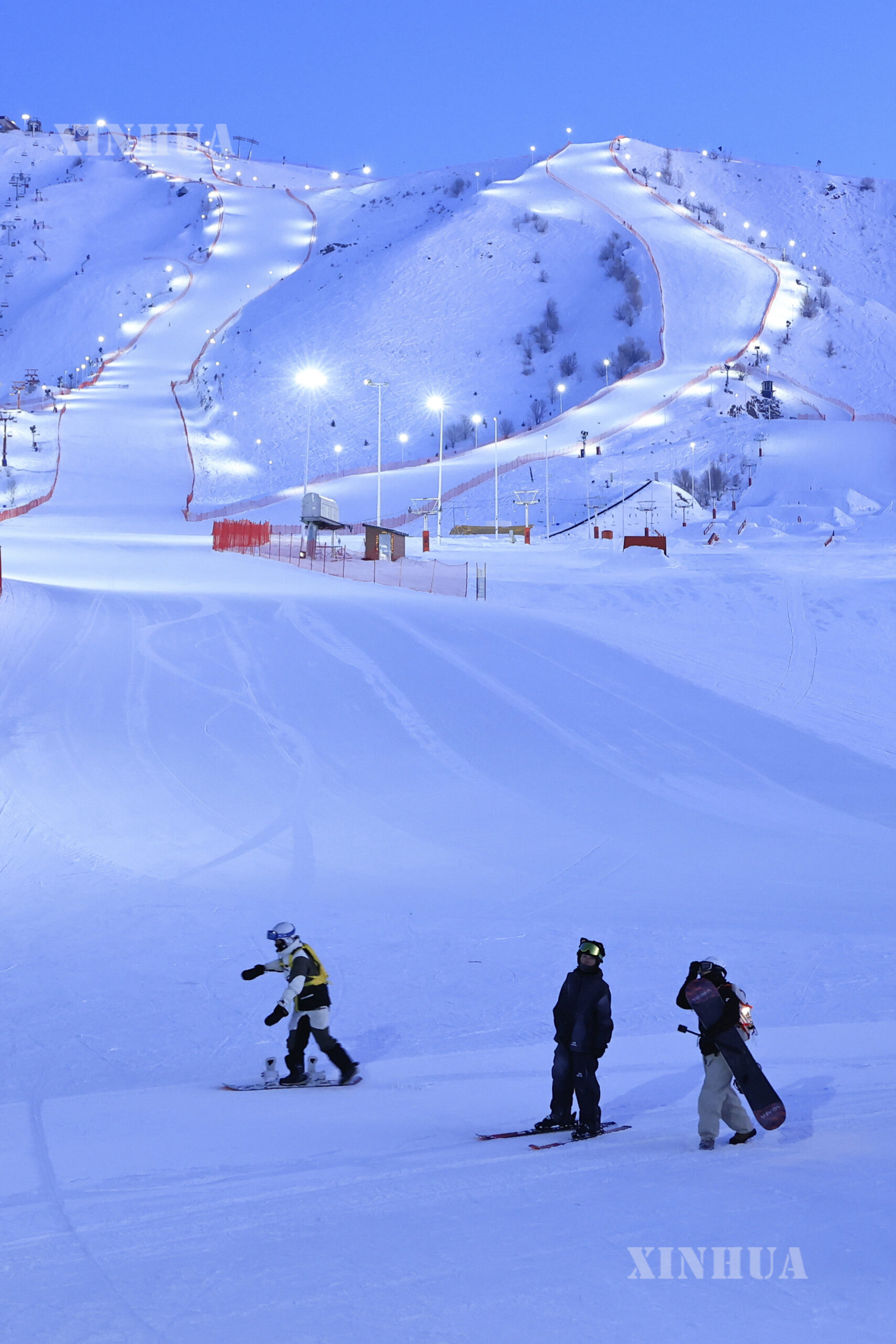 တရုတ်နိုင်ငံ ရှင်းကျန်းဒေသ အားလက်ထိုက်ဒေသခွဲရှိ Jiangjunshan International Ski Resort ဧရိယာတွင် “နေဝင်ဆည်းဆာပါတီပွဲ” တက်ရောက်လာကြသော နှင်းလျှောစီးဝါသနာရှင်များကို ၂၀၂၆ ခုနှစ် ဖေဖော်ဝါရီ ၂၅ ရက်က တွေ့ရစဉ် (ဆင်ဟွာ)