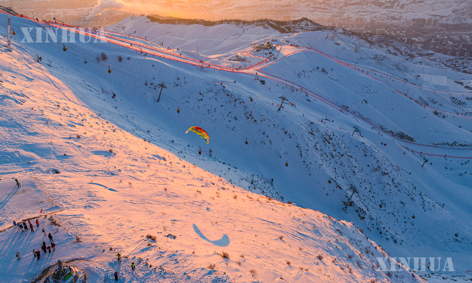 图说2:2月25日,滑雪爱好者在新疆阿勒泰将军山国际滑雪度假区参加“夕阳派对”(无人机照片)。新华社发(努尔别克·努尔曼 摄)