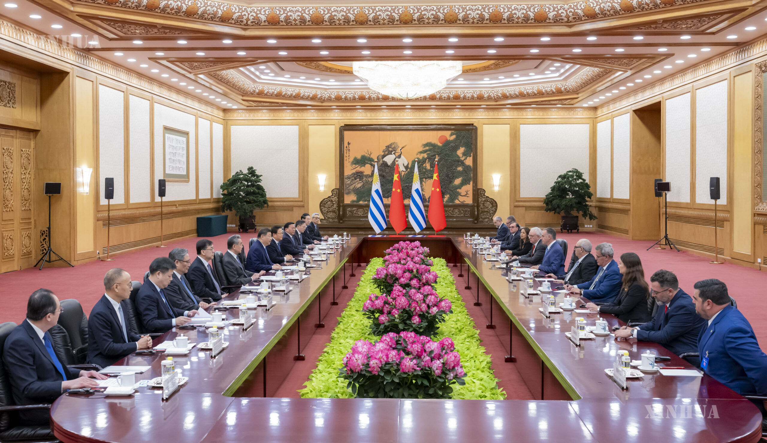တရုတ်နိုင်ငံ သမ္မတ ရှီကျင့်ဖိန်နှင့် တရုတ်နိုင်ငံသို့ နိုင်ငံတော်ခရီးစဉ်ရောက်ရှိလာသော ဥရုဂွေးနိုင်ငံ သမ္မတ Yamandu Orsi တို့ ဖေဖော်ဝါရီ ၃ ရက် နံနက်ပိုင်းက ပေကျင်းမြို့ ပြည်သူ့ခန်းမဆောင်တွင် တွေ့ဆုံဆွေးနွေးစဉ် (ဆင်ဟွာ)