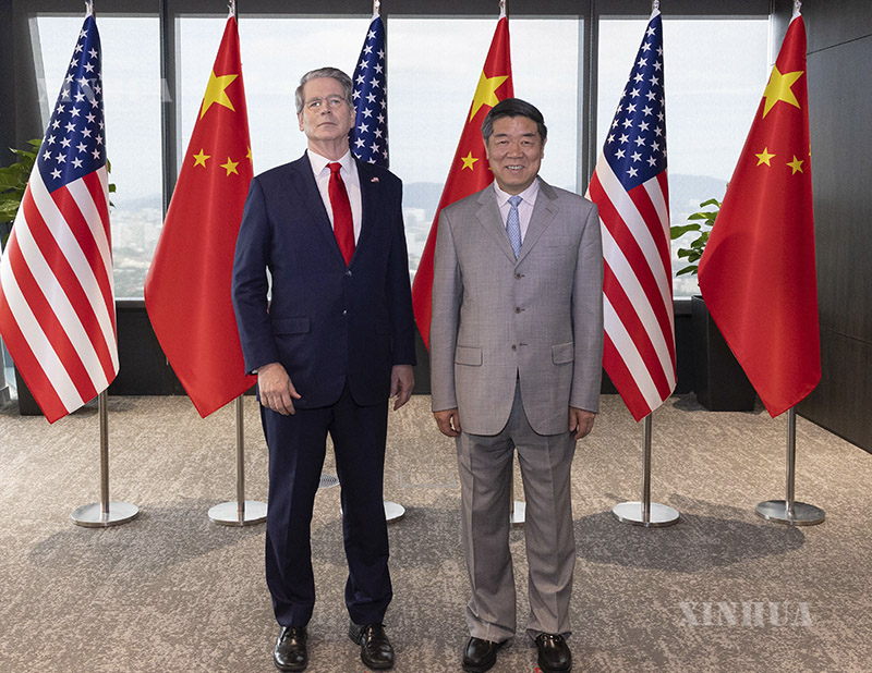 图说:当地时间2025年10月25日至26日,中美两国经贸团队在马来西亚吉隆坡举行中美经贸磋商。这是10月25日磋商前,中共中央政治局委员、国务院副总理何立峰与美国财政部长贝森特合影。 新华社记者 白雪骐 摄
