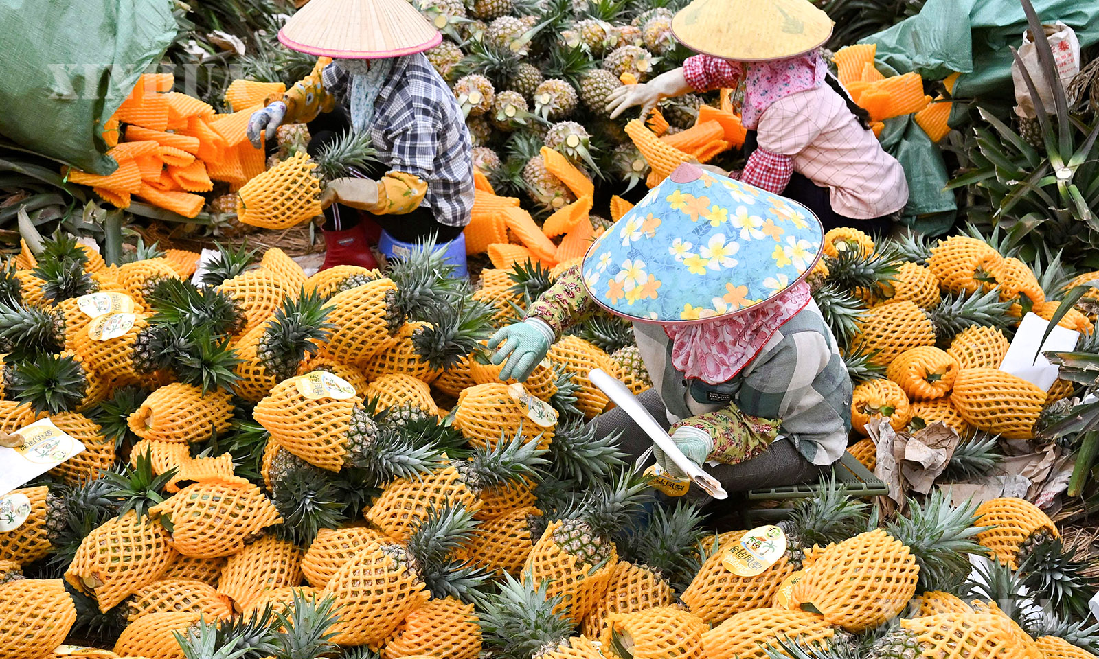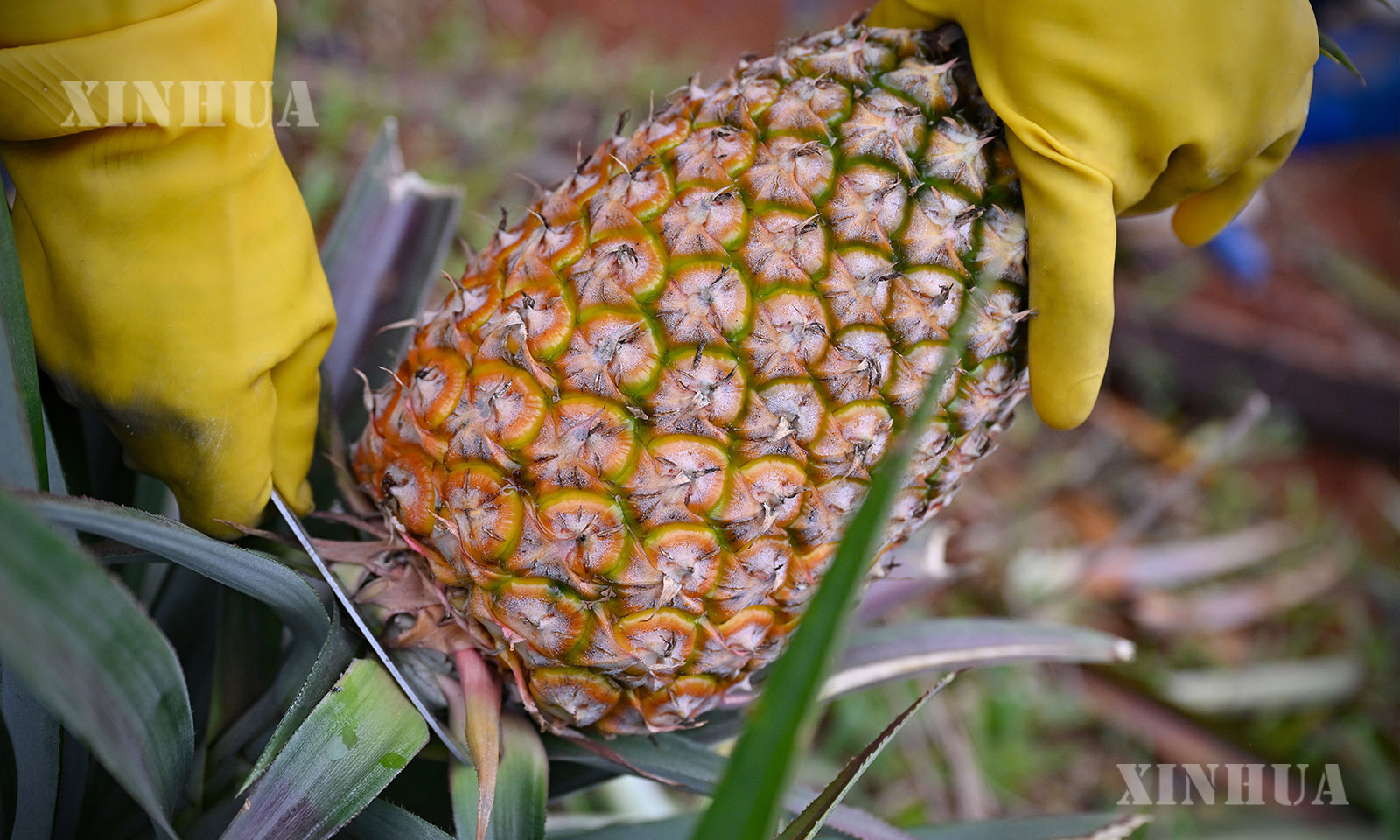 近日,海南省海口市琼山区大坡镇的金钻凤梨种植基地迎来集中采收期,当地农户抢抓农时采摘凤梨。