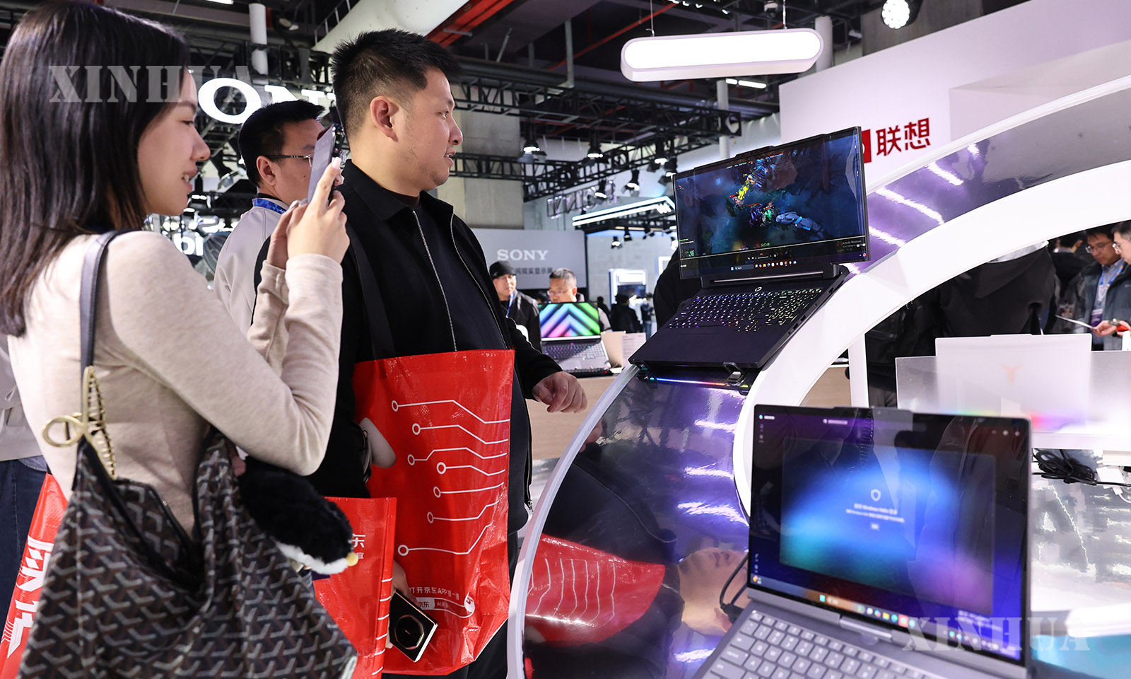 တရုတ်နိုင်ငံ ရှန်ဟိုင်း အရှေ့တိုင်းစီးပွားရေးပူးပေါင်းဆောင်ရွက်မှုဇုန် ပြခန်းဧရိယာတွင် ဖန်သားပြင်ကို ခေါက်သိမ်း၊ ဆန့်ထုတ်နိုင်သော လက်ပ်တော့ပ်ကွန်ပျူတာထုတ်ကုန်ရှေ့၌ ကြည့်ရှုနေကြသူများကို ၂၀၂၆ ခုနှစ် မတ် ၁၂ ရက်က တွေ့ရစဉ် (ဆင်ဟွာ)