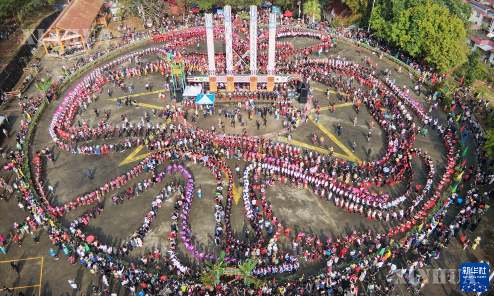 တရုတ်နိုင်ငံ ယူနန်ပြည်နယ် တက်ဟုန်းပြည်နယ်ခွဲ ယဉ်ကျန်းခရိုင်တွင် မနောပွဲတော် ပါဝင်တက်ရောက်သည့် ဒေသခံပြည်သူများနှင့် ခရီးသွားဧည့်သည်များ အတူကခုန်ရင်း ဝင်ရောက်လာနေသည်ကို ၂၀၂၆ ခုနှစ် မတ် ၁၄ ရက်က တွေ့ရစဉ် (ဆင်ဟွာ)