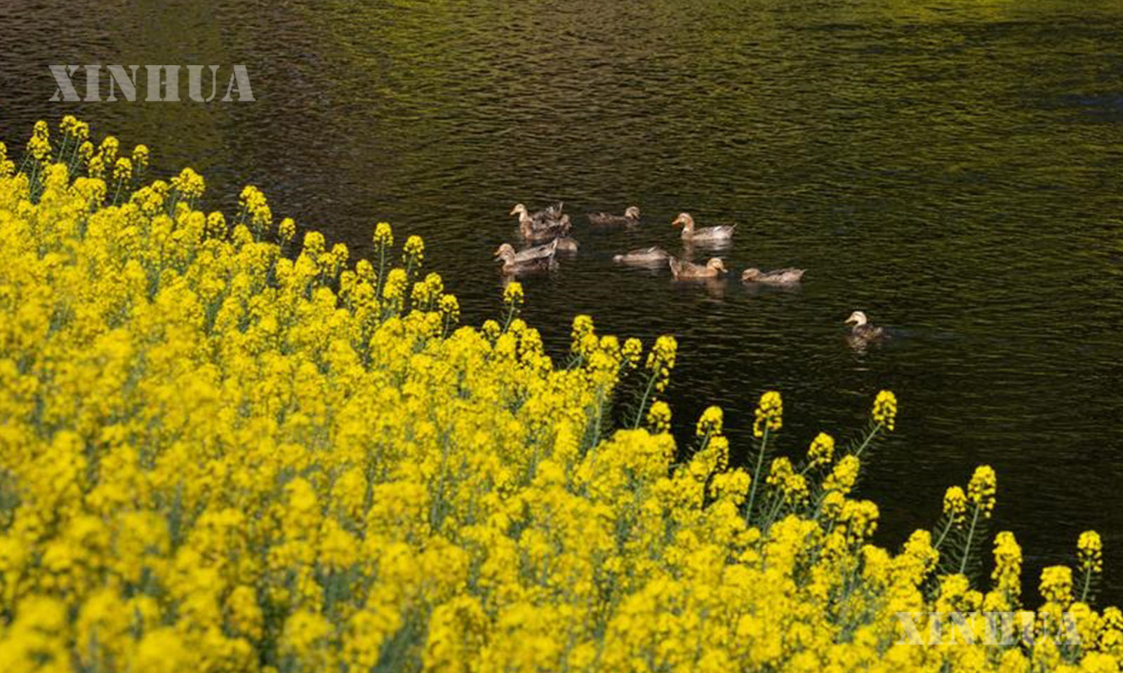 တရုတ်နိုင်ငံ စီချွမ်းပြည်နယ် အော်မေဆန်းမြို့ ဖူရှီးမြို့နယ်ရှိ အော်မေမြစ်တွင် ဘဲအုပ်တစ်အုပ် အစာရှာရေကူးနေကြပြီး ကမ်းစပ်တွင် ရွှေရောင် မုန်ညင်းပန်းများ ပွင့်နေသည်ကို ၂၀၂၆ ခုနှစ် မတ် ၄ ရက်က တွေ့ရစဉ် (ဆင်ဟွာ)