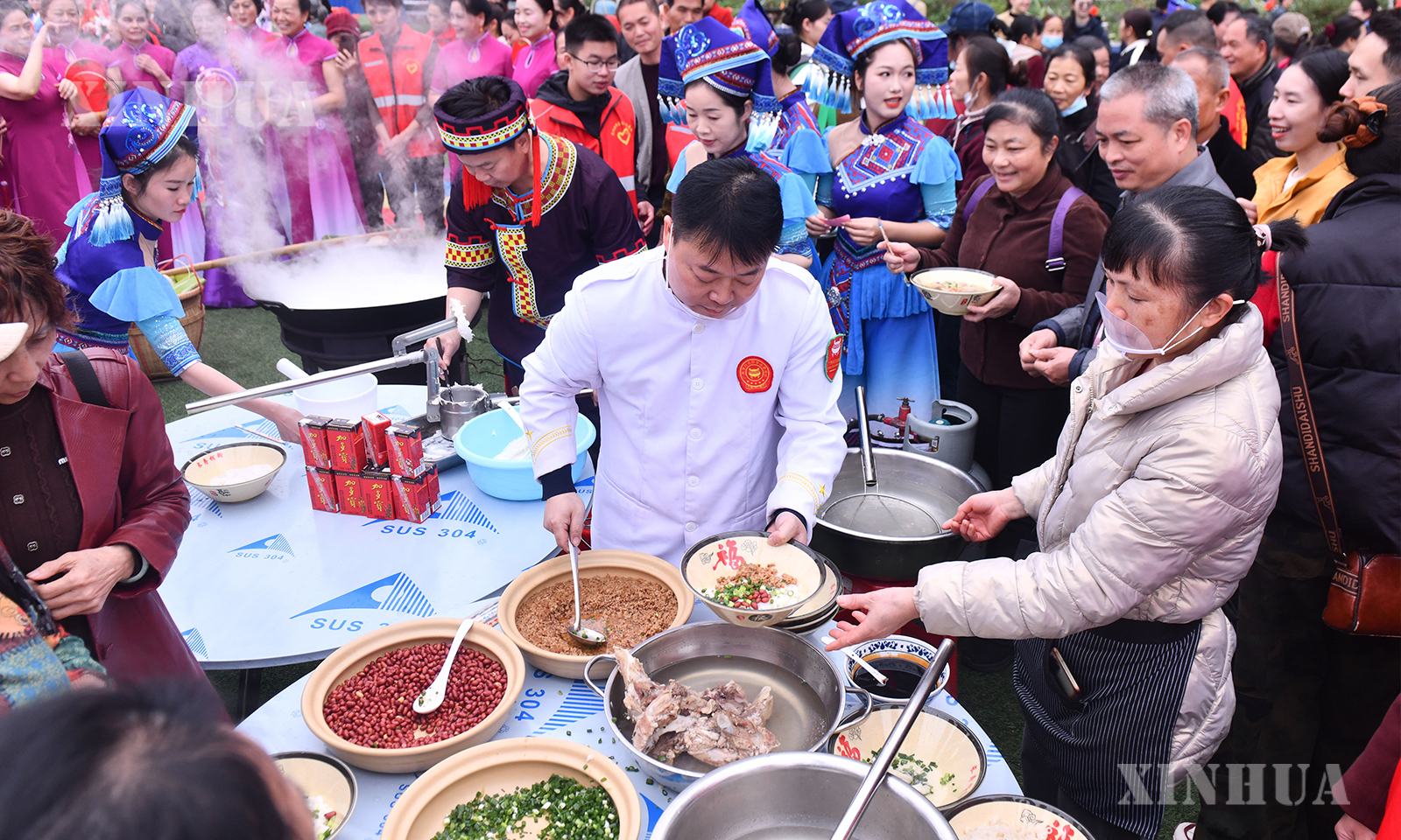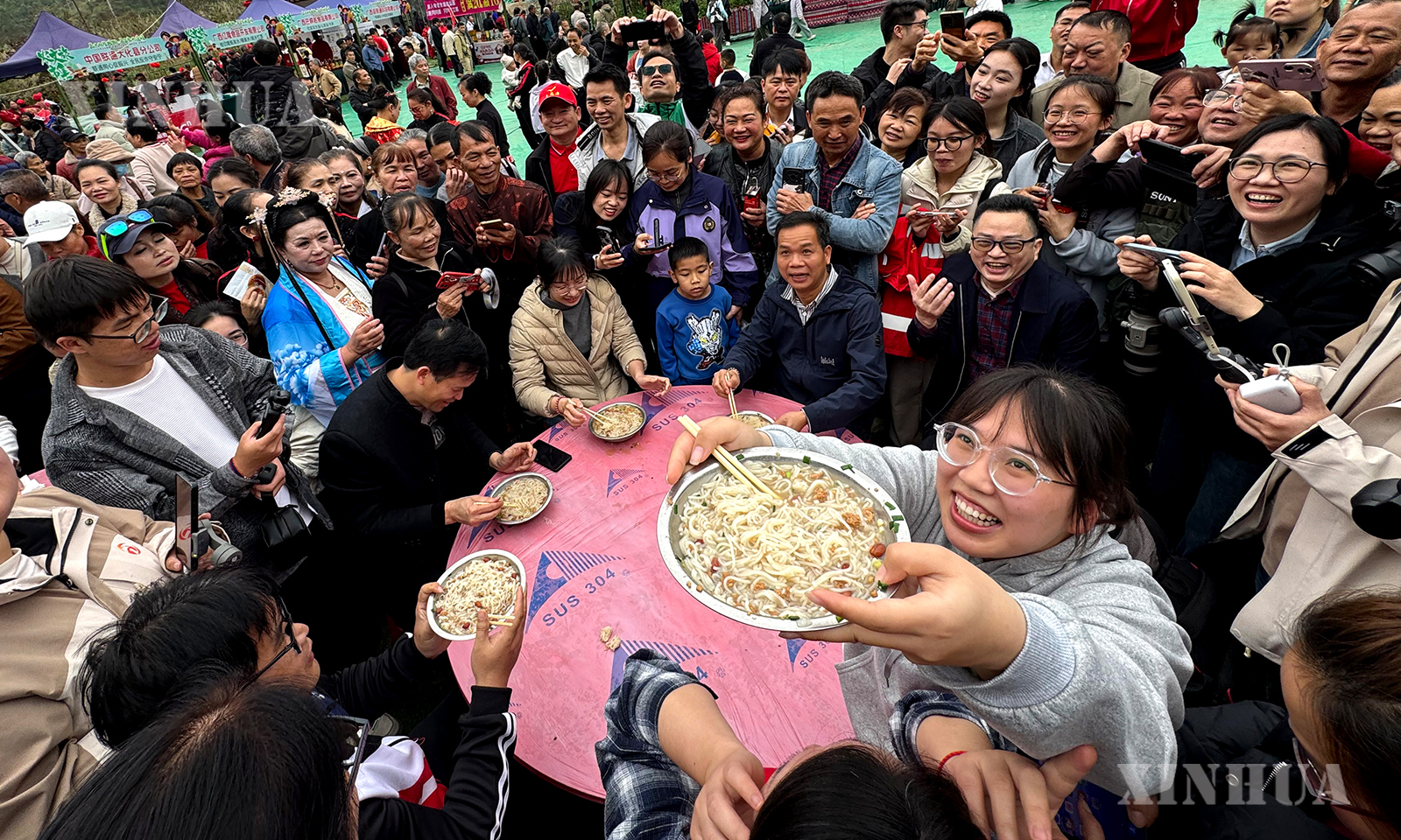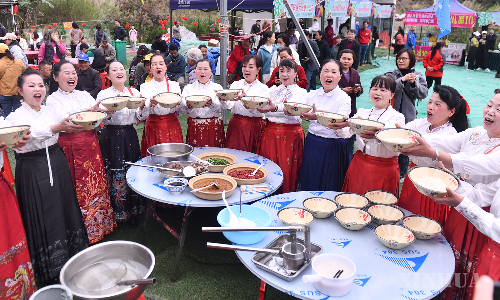 2、人们在广西河池市大化瑶族自治县“生榨米粉非遗技艺比拼”活动中展示生榨米粉(3月21日摄)。新华社记者 黄孝邦 摄