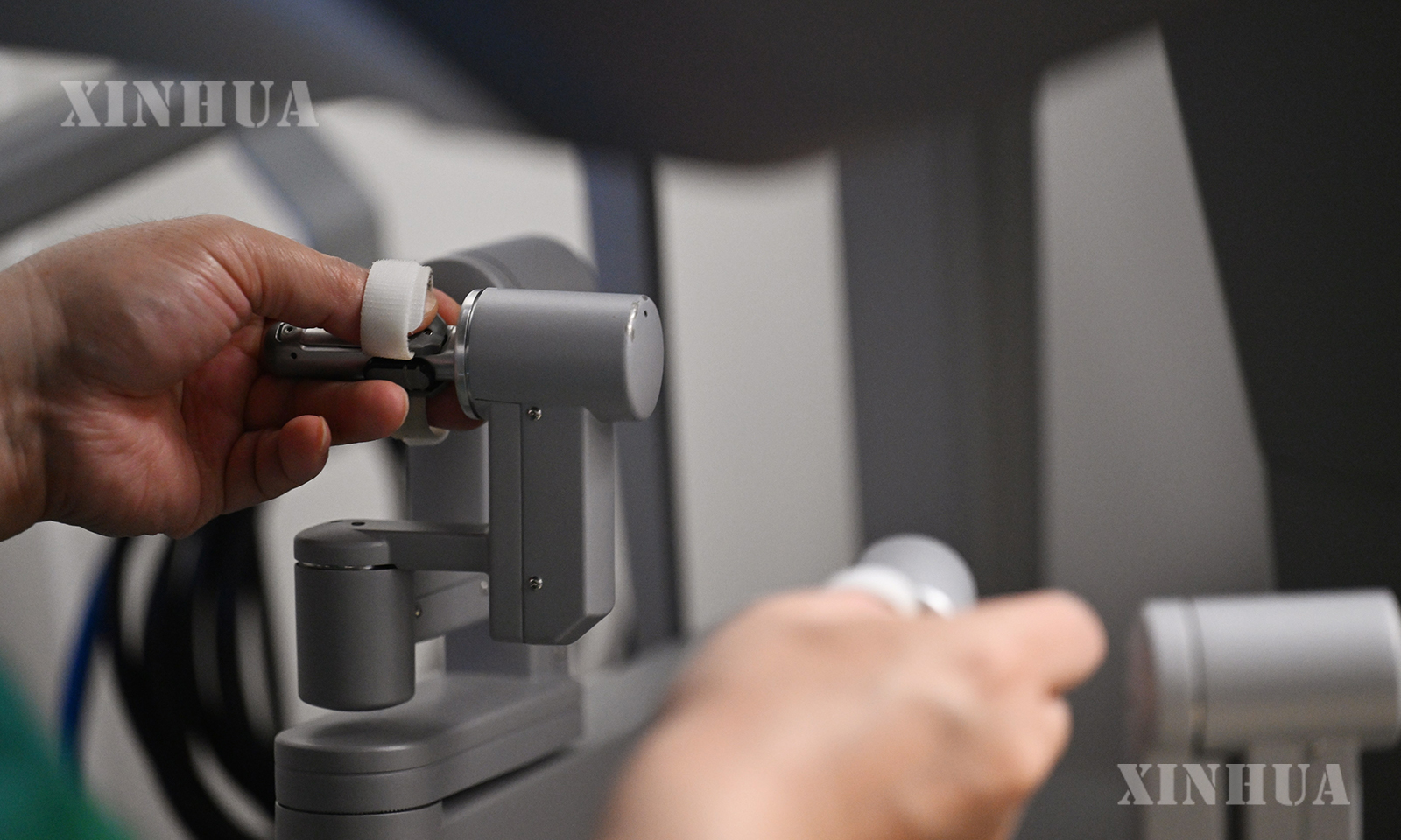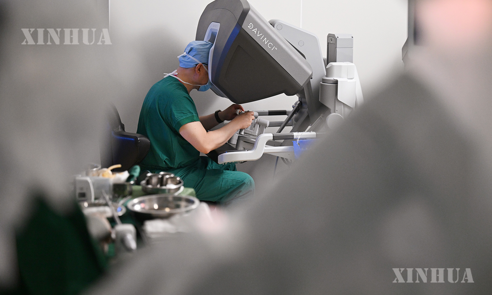 တရုတ်နိုင်ငံ ထျန်းကျင်းမြို့ရှိ ထျန်းကျင်းဆေးတက္ကသိုလ် အကျိတ်ဆေးရုံမှ အစာရေပြွန်အကျိတ် မှန်ပြောင်းထည့်ခွဲစိတ်မှုဌာန ဌာနမှူး ကျန်းဟုန်ကျင်က da Vinci ခွဲစိတ်ကုသမှုစက်ရုပ်အား ထိန်းချုပ်လုပ်ဆောင်နေသည်ကို ၂၀၂၆ ခုနှစ် ဧပြီ ၁၉ ရက်က တွေ့ရစဉ် (ဆင်ဟွာ)