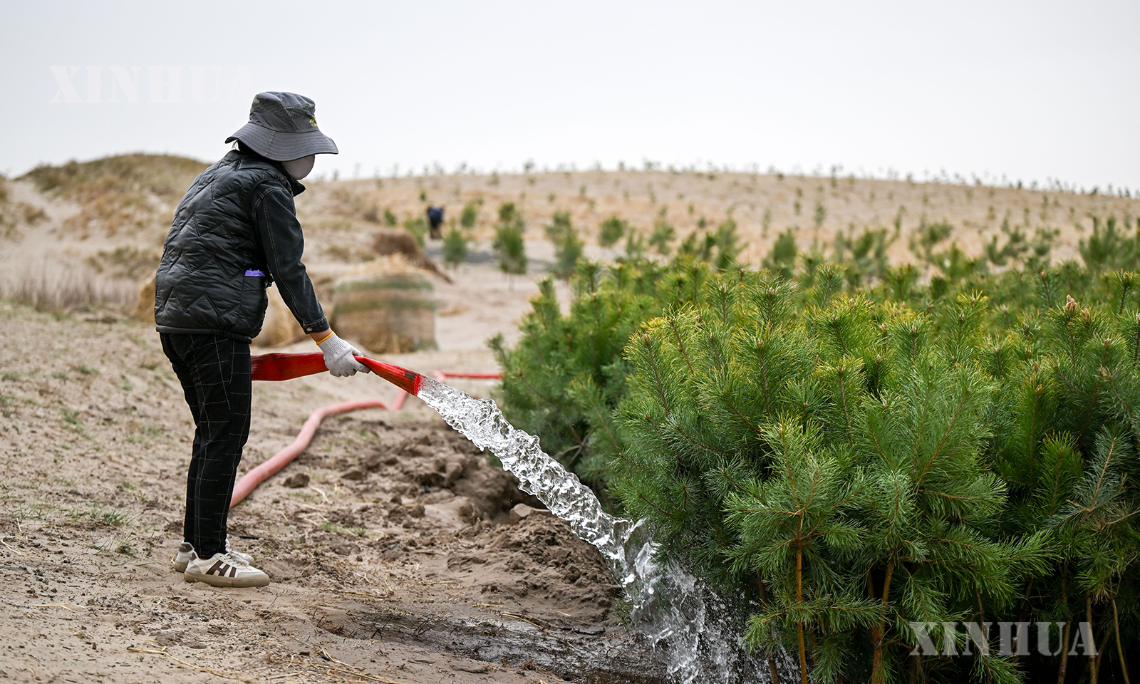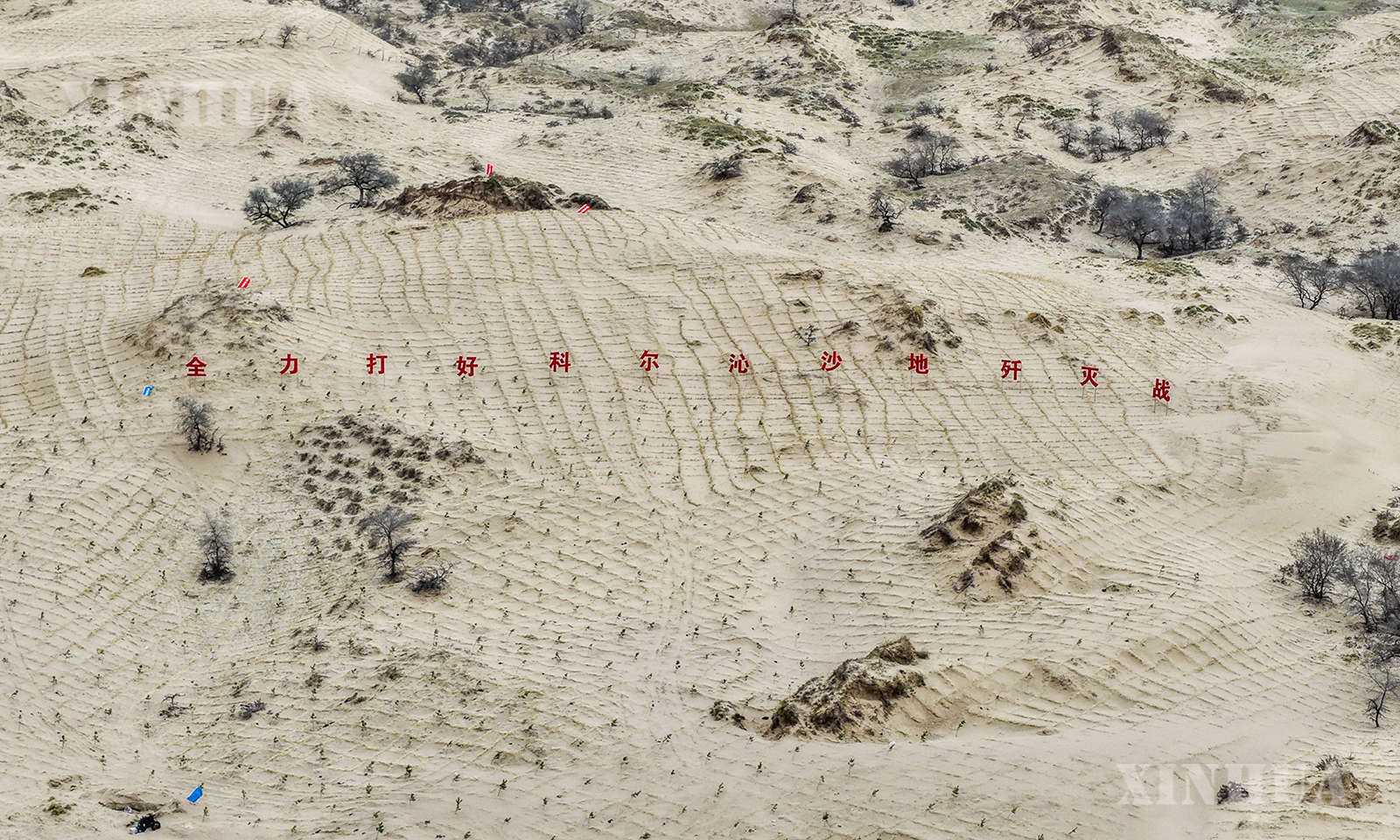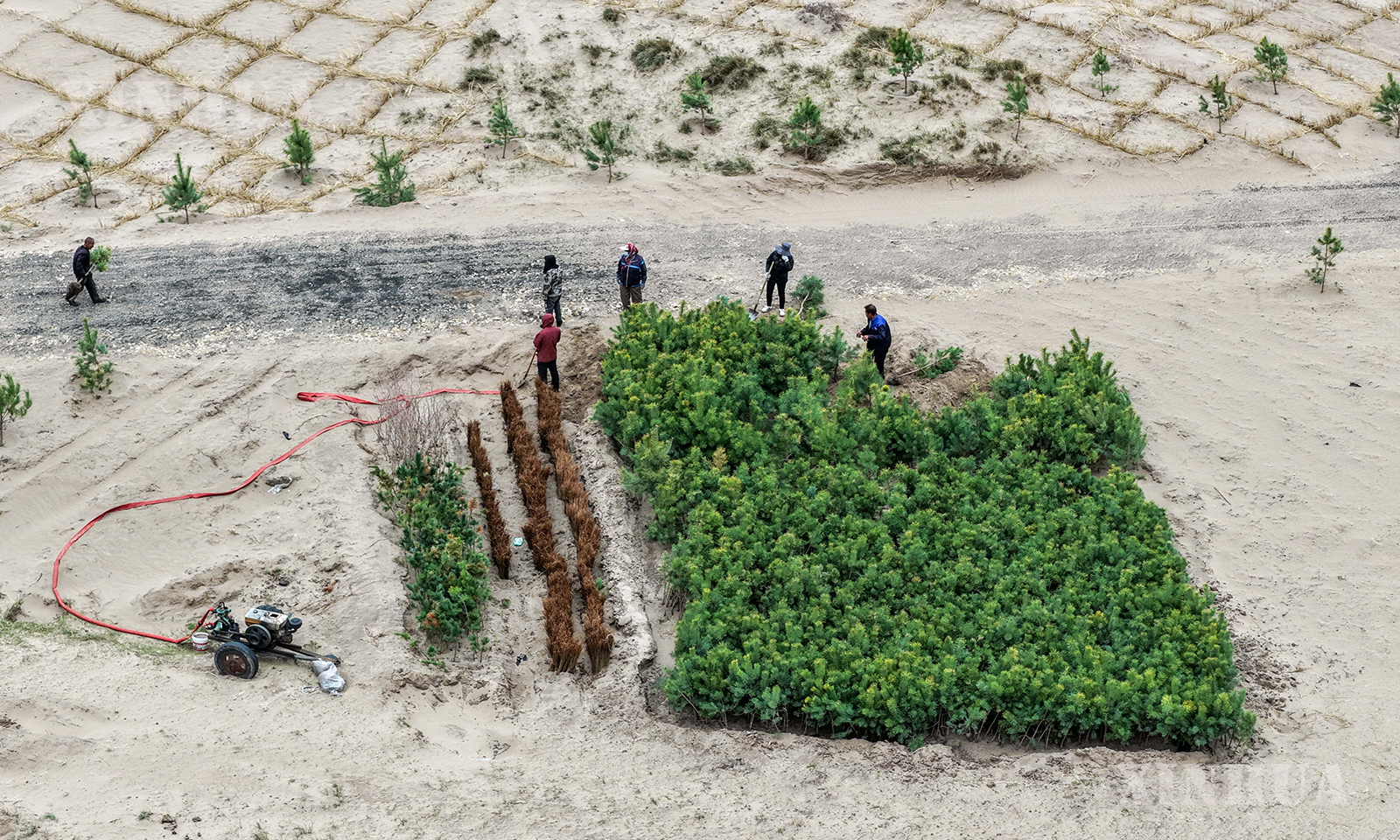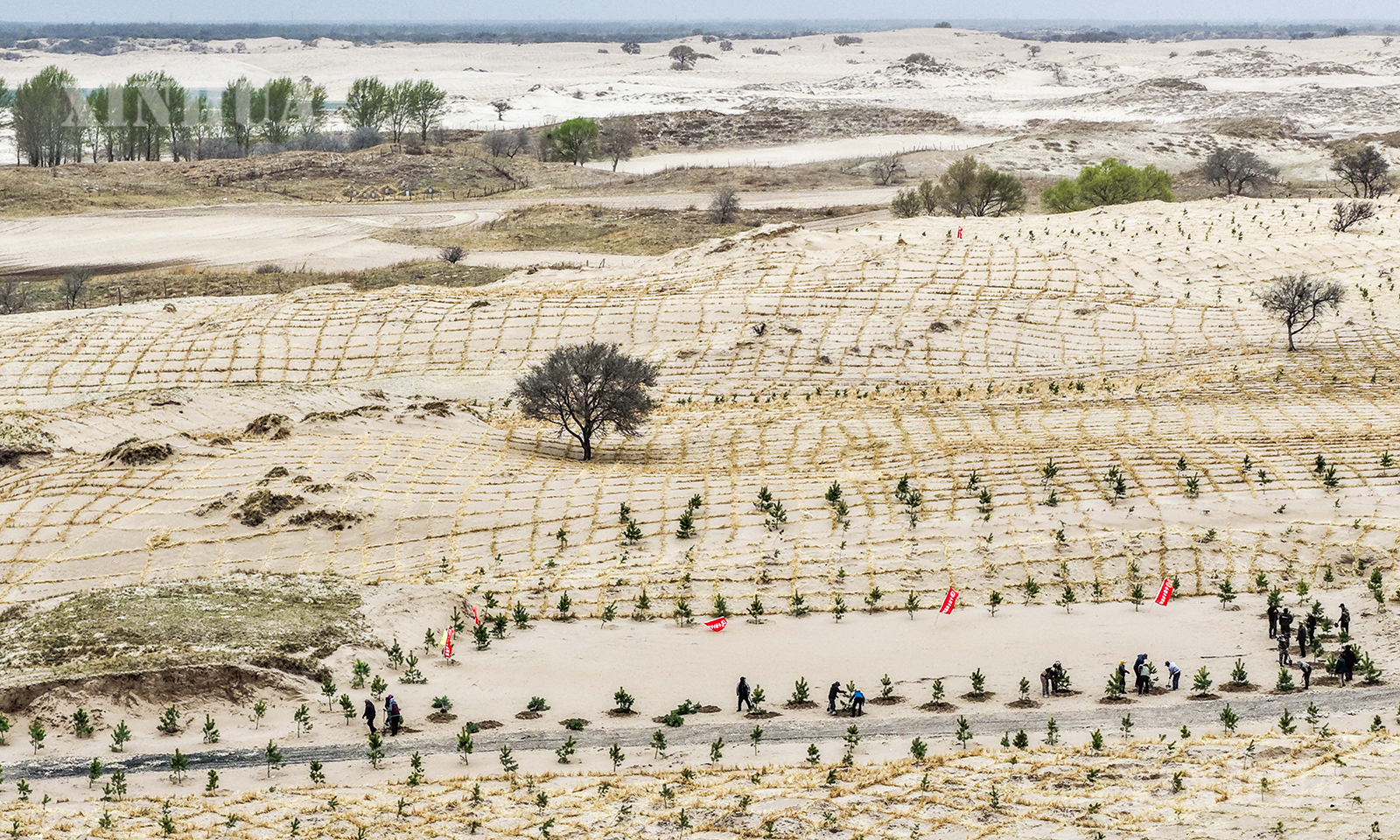 တရုတ်နိုင်ငံ အတွင်းမွန်ဂိုလီးယားကိုယ်ပိုင်အုပ်ချုပ်ခွင့်ရဒေသ၊ ထုန်းလျောင်မြို့၊ ခဲအယ်ချင့် ကျော်ရိ ဟို့ချီ ရှိ စုလိကူထိုင် သဲကန္တာရကာကွယ်ရေးနှင့် သဲကန္တာရစီမံခန့်ခွဲရေး စီမံကိန်းနယ်မြေတွင် အလုပ်သမားများသည် ကောက်ရိုးကွက်များခင်းကျင်းခြင်းနှင့် Scots ထင်းရှူးပင်များ စိုက်ပျိုးခြင်းတို့ကို ဆောင်ရွက်ကာ သဲသောင်ပြင်များကို အစိမ်းရောင် ဆင်မြန်းပေးခဲ့သည်။