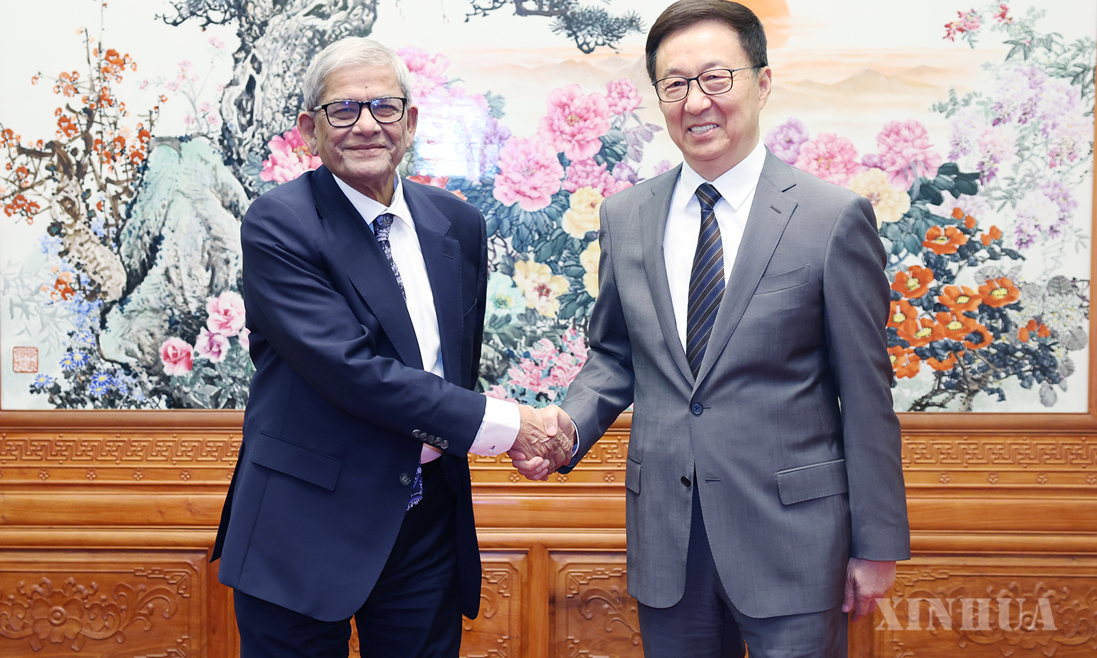 တရုတ်နိုင်ငံ ပေကျင်းမြို့၌ တရုတ်နိုင်ငံ ဒုတိယသမ္မတ ဟန်ကျိန့်နှင့် ဘင်္ဂလားဒေ့ရှ် အမျိုးသားရေးပါတီ (BNP) အထွေထွေအတွင်းရေးမှူးချုပ်၊ ဒေသန္တရအစိုးရ၊ ကျေးလက်ဒေသ ဖွံ့ဖြိုးတိုးတက်ရေးနှင့် သမဝါယမဝန်ကြီး Mirza Fakhrul Islam Alamgir ဦးဆောင်သော BNP ပါတီ အဆင့်မြင့်ကေဒါ လေ့လာရေးအဖွဲ့တို့ ၂၀၂၆ ခုနှစ် ဧပြီ ၂၁ ရက်က တွေ့ဆုံဆွေးနွေးစဉ် (ဆင်ဟွာ)