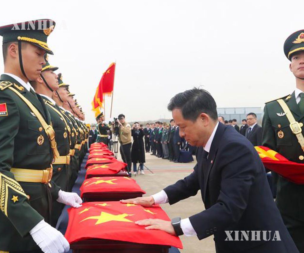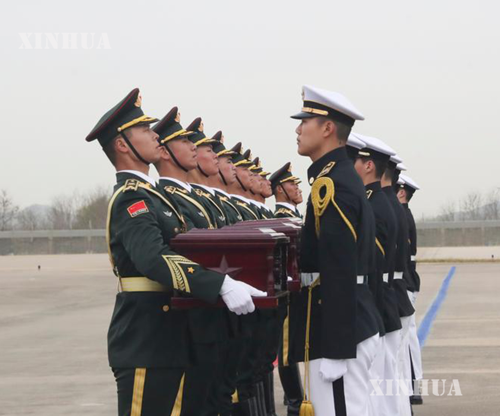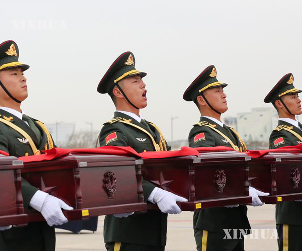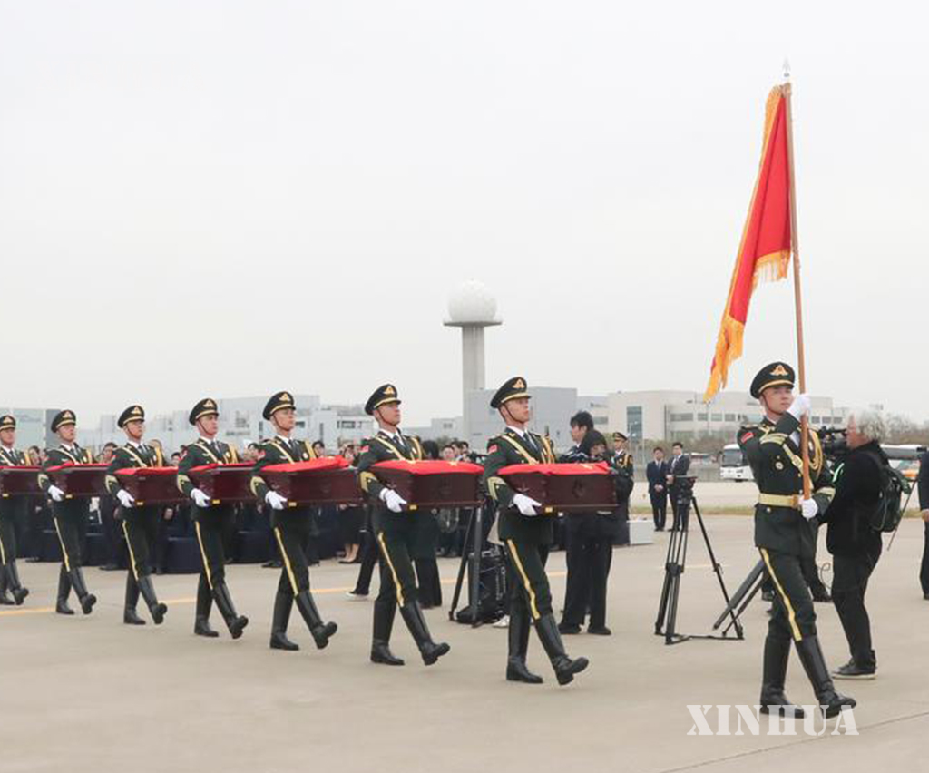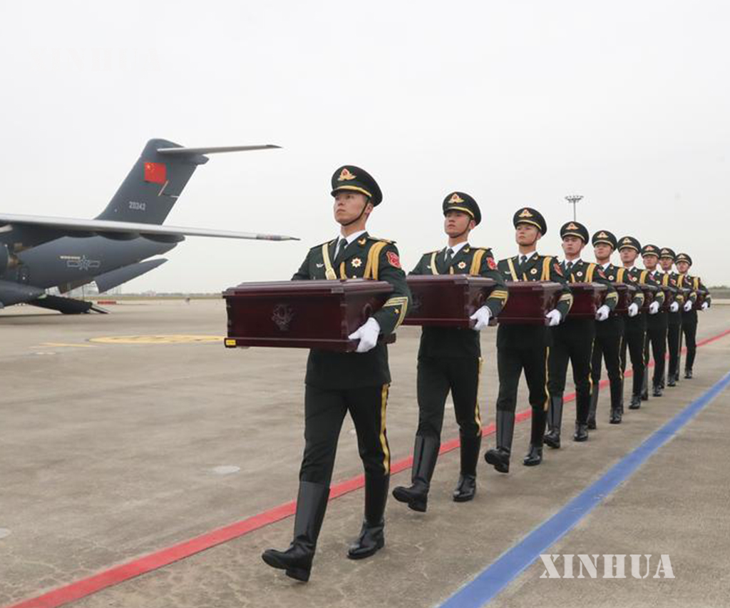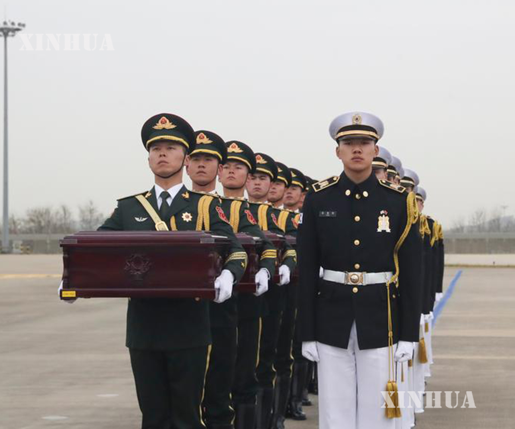တရုတ်-တောင်ကိုရီးယား နှစ်ဖက်ကိုယ်စားလှယ်များက လွှဲပြောင်းပေးအပ်ခြင်းဆိုင်ရာ စာချွန်လွှာများကို လက်မှတ်ရေးထိုးခဲ့ကြပြီး တရုတ်နိုင်ငံဘက်က ဝမ်းနည်းခြင်းအောက်မေ့ဖွယ်အခမ်းအနား ကျင်းပခဲ့သည်။ အခမ်းအနားတွင် တရုတ်ပြည်သူ့သမ္မတနိုင်ငံ၏ နိုင်ငံတော်သီချင်းအား တီးမှုတ်သီဆိုကြရာ တောင်ကိုရီးယားနိုင်ငံဆိုင်ရာ တရုတ်နိုင်ငံ သံအမတ်ကြီး သိုက်ပင်းက စေတနာ့ဝန်ထမ်း အာဇာနည်စစ်သည်များ၏ ခေါင်းတလားများအတွက် နိုင်ငံတော်အလံ လွှမ်းခြုံပေးပြီး တရုတ်နိုင်ငံဘက် လူပုဂ္ဂိုလ်အားလုံးသည် စေတနာ့ဝန်ထမ်း အာဇာနည်စစ်သည်များ၏ ရုပ်ကြွင်းပစ္စည်းများကို သုံးကြိမ် ဦးညွှတ်၍ ဂါရဝပြုခဲ့ကြသည်။ ထို့နောက် တရုတ်ပြည်သူ့လွတ်မြောက်ရေးတပ်မတော် ဂုဏ်ပြုတပ်ဖွဲ့စစ်သည်များက နိုင်ငံတော်အလံကို ကိုင်ဆောင်လျက် အာဇာနည်စစ်သည်များ၏ ခေါင်းတလားများအား တရုတ်ပြည်သူ့လွတ်မြောက်ရေးတပ်မတော် လေတပ် သယ်ယူပို့ဆောင်ရေး လေယာဉ် Y-20B ပေါ်သို့ သယ်ဆောင်ကာ အမိမြေနှင့် ပြည်သူများ၏ ရင်ခွင်သို့ ပြန်လည်ရောက်ရှိစေရန် အာဇာနည်များအား ပြန်လည်ခေါ်ဆောင်ခဲ့သည်။ (Xinhua)