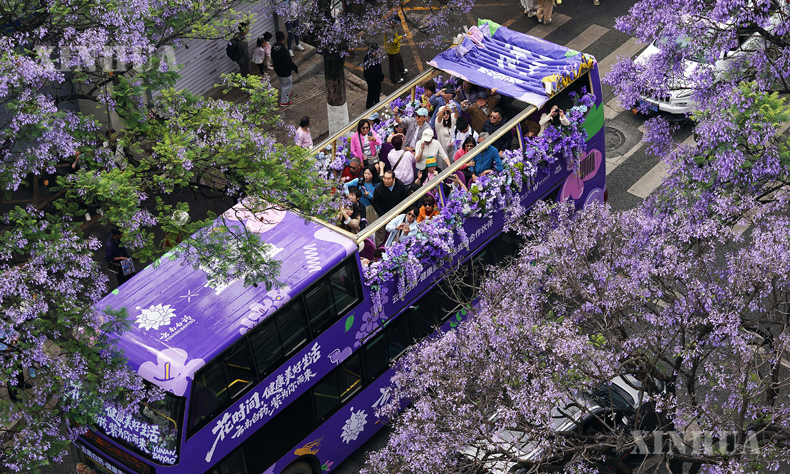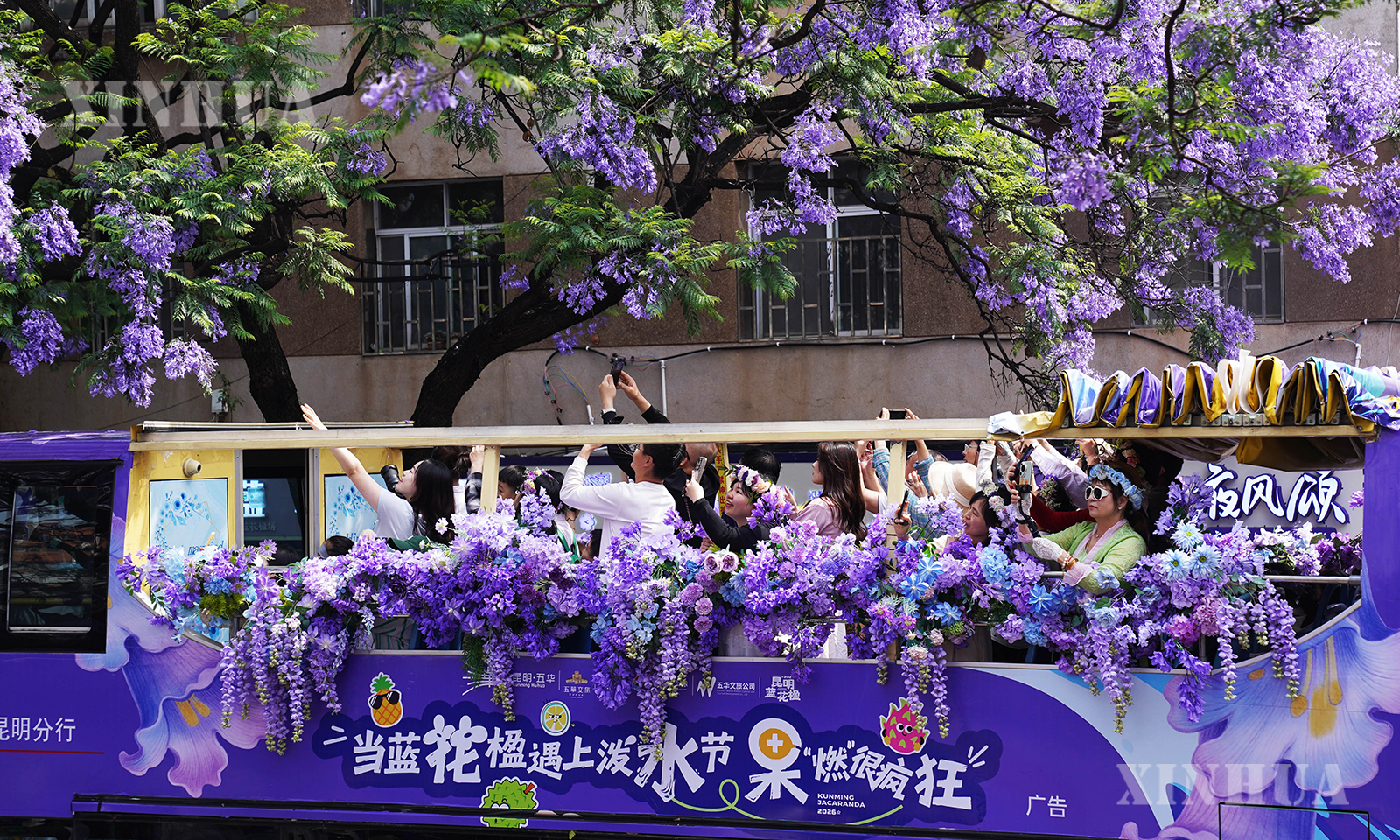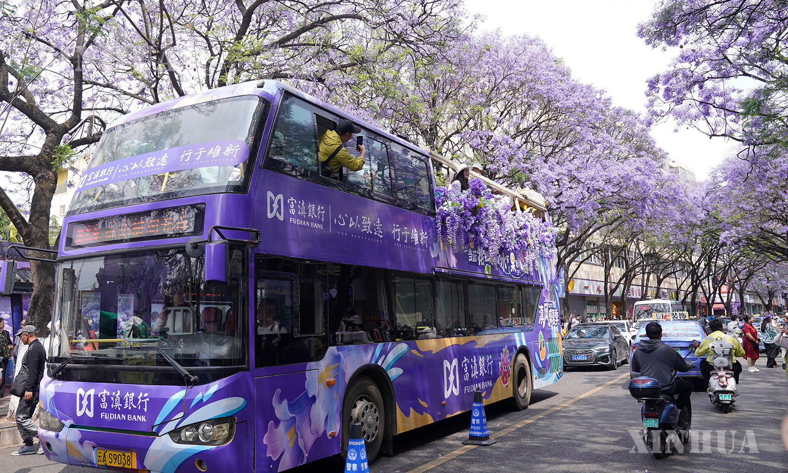 图说1、2、3:4月26日,游客乘坐蓝花楹观光巴士经过昆明市教场中路。 新华社发(梁志强摄)