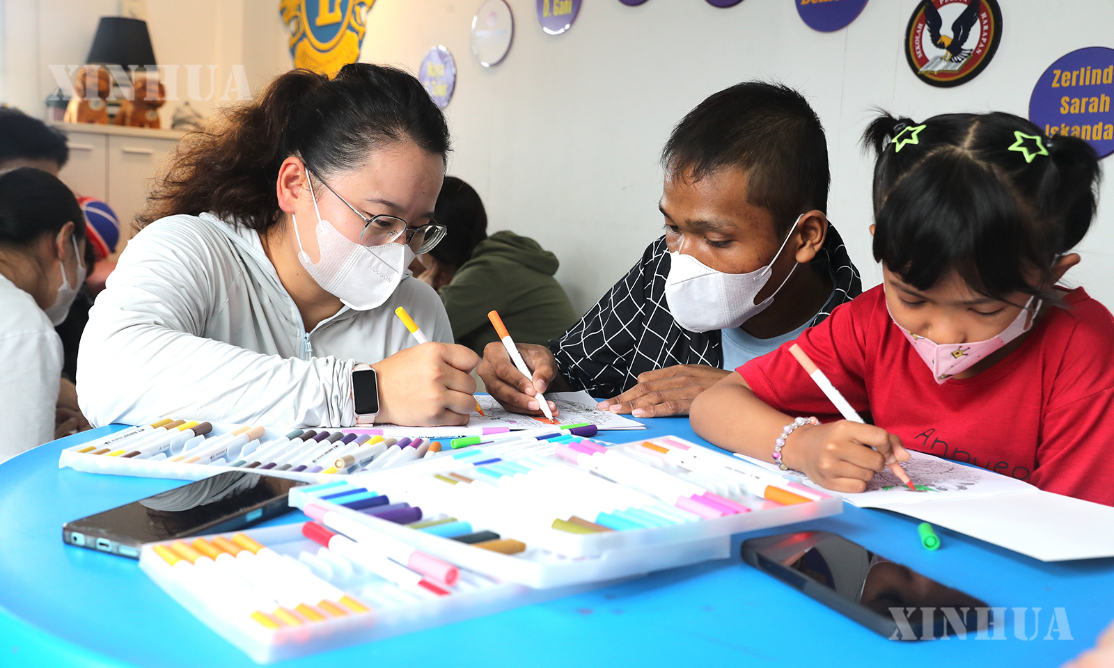2、4月19日,在印度尼西亚雅加达,石凯欣(左)陪当地儿童癌症中心的小朋友画画。新华社记者 岑云鹏 摄