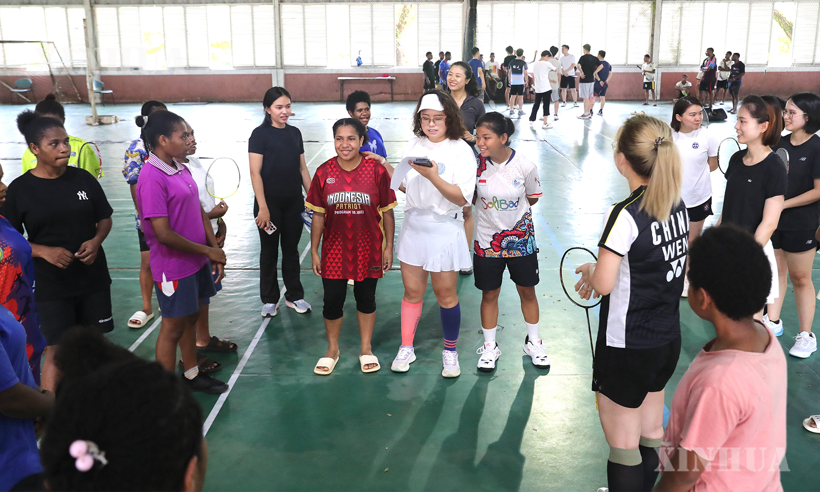 3、4月25日,在印度尼西亚万丹省唐格朗,石凯欣(中)组织志愿者和来自巴布亚部落的孩子们打羽毛球。新华社记者 岑云鹏 摄