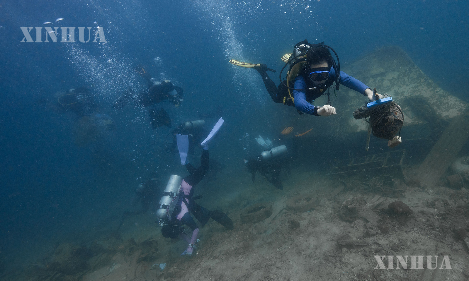 1、4月12日,在印度尼西亚茂物,石凯欣(前)和志愿者在徒步途中收集垃圾。 新华社记者 岑云鹏 摄