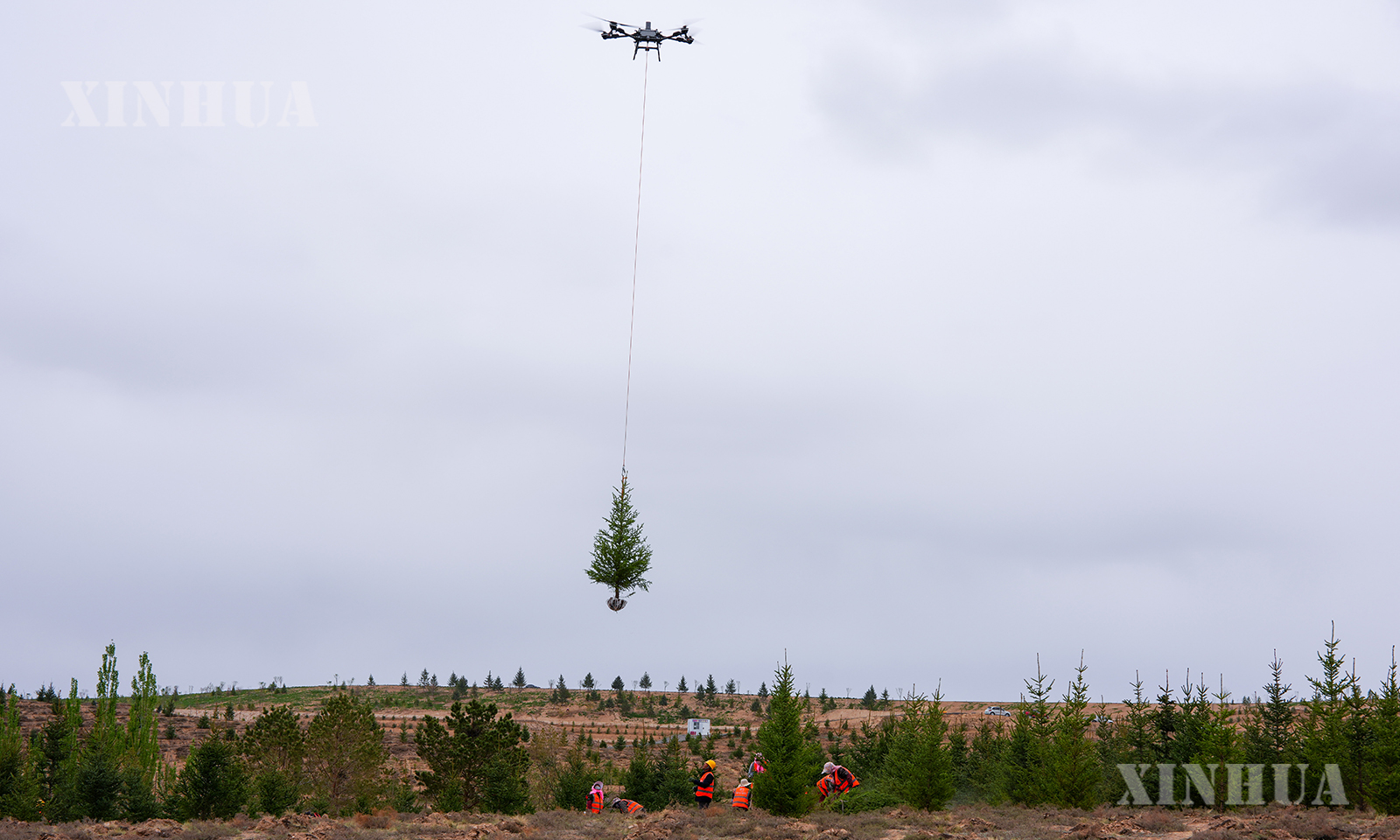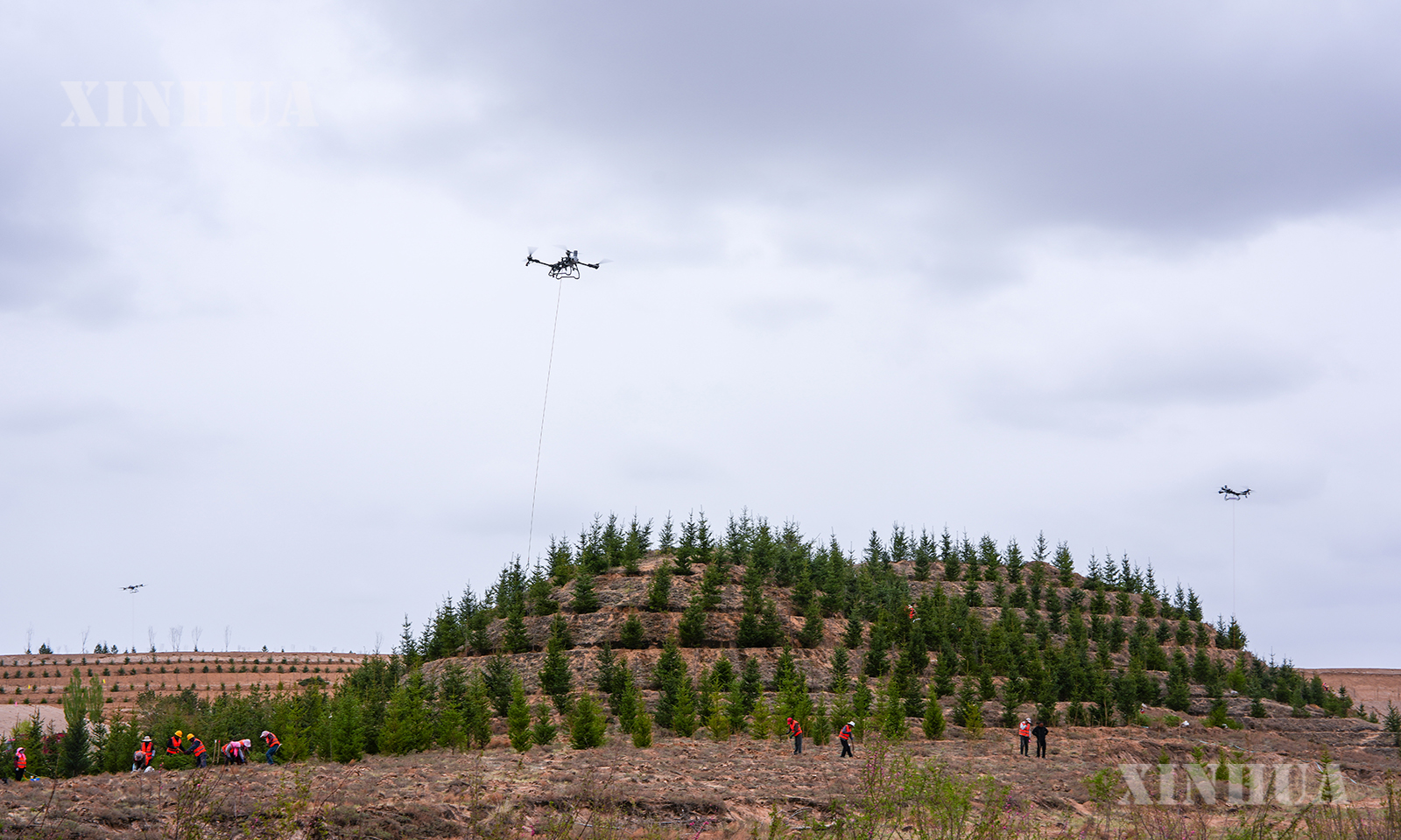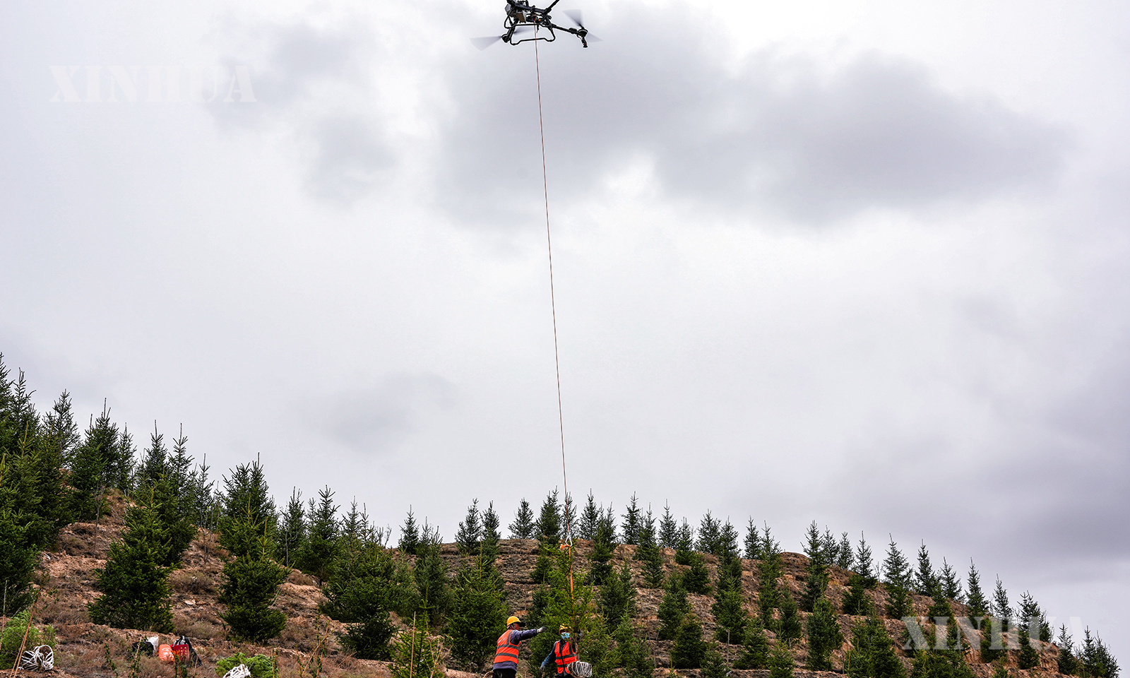 图说2:4月27日,兰州新区南部郊野公园一处山坡上,无人机吊运苗木助力植树造林。新华社记者 郎兵兵 摄