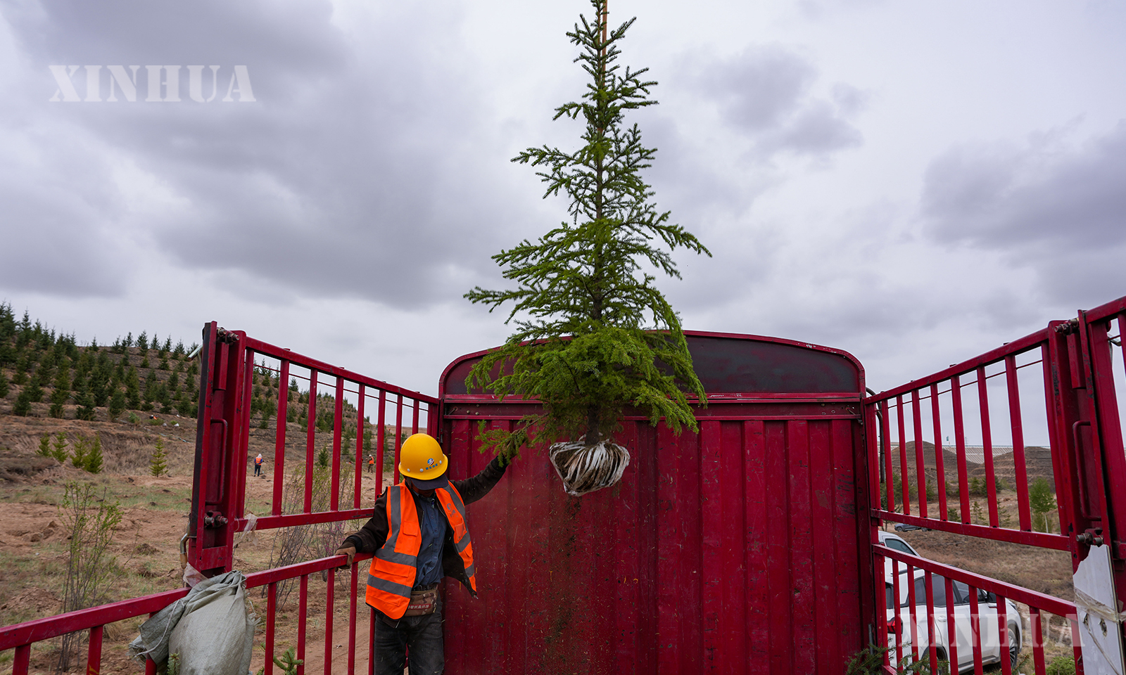 图说1:4月27日,兰州新区南部郊野公园一处山坡上,工作人员接收无人机吊运的苗木。 新华社记者 郎兵兵 摄