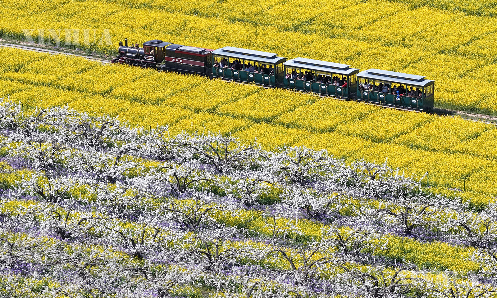 1、4月6日,游客乘观光小火车从河北省晋州市周家庄乡第九生产队梨园旁经过(无人机照片)。 新华社记者 杨世尧 摄