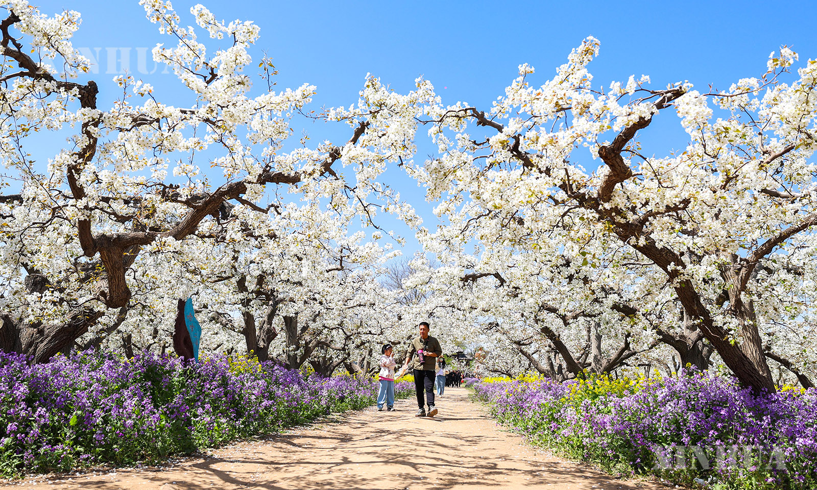 2、4月6日,游客在河北省晋州市周家庄乡梨园内赏花游玩。新华社发(梁子栋摄)