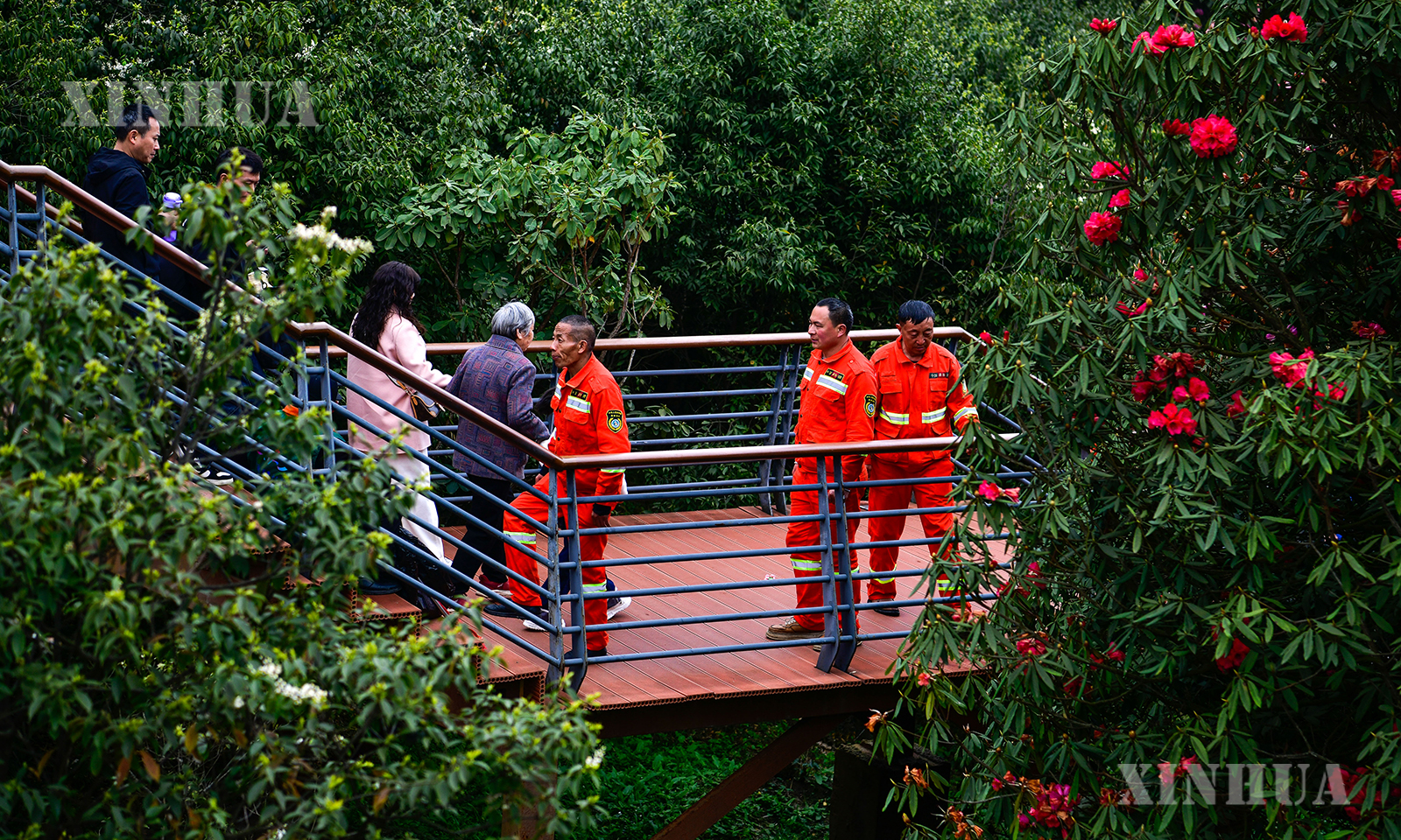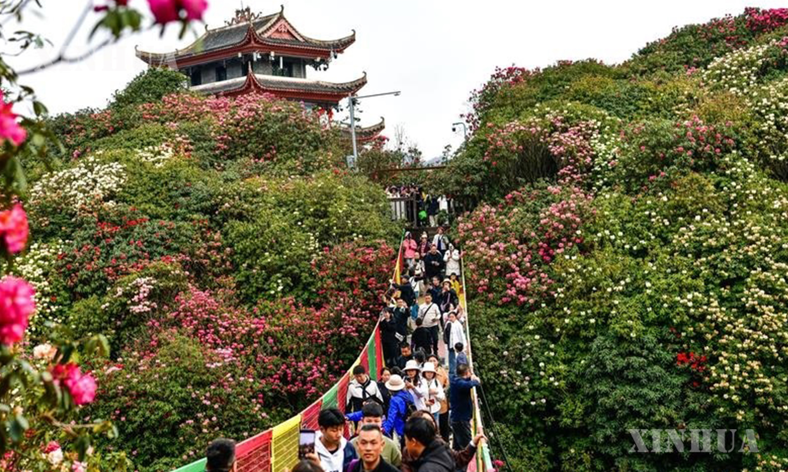 တရုတ်နိုင်ငံ ကွေ့ကျိုးပြည်နယ် ပိကျယ်မြို့ ပိုင်လီ တောင်ဇလပ်ပင်စီမံခန့်ခွဲရေးဇုန်ရှိ ကျင်းဖော ရှုခင်းသာဧရိယာတွင် ပန်းများရှုစား၍ လည်ပတ်နေကြသော ခရီးသွားဧည့်သည်များအား ၂၀၂၆ ခုနှစ် ဧပြီ ၁ ရက်က တွေ့ရစဉ် (ဆင်ဟွာ)