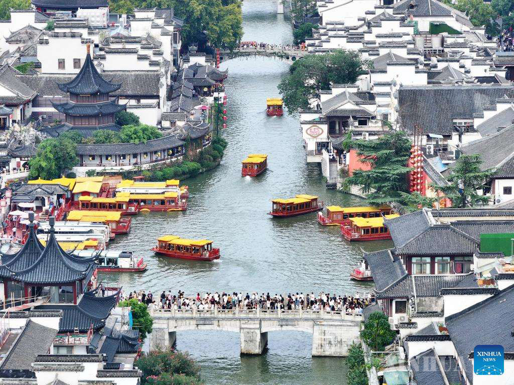 An aerial drone photo taken on Oct. 1, 2025 shows people visiting Confucius Temple scenic area in Nanjing, east China’s Jiangsu Province. (Photo by Liu Jianhua/Xinhua)