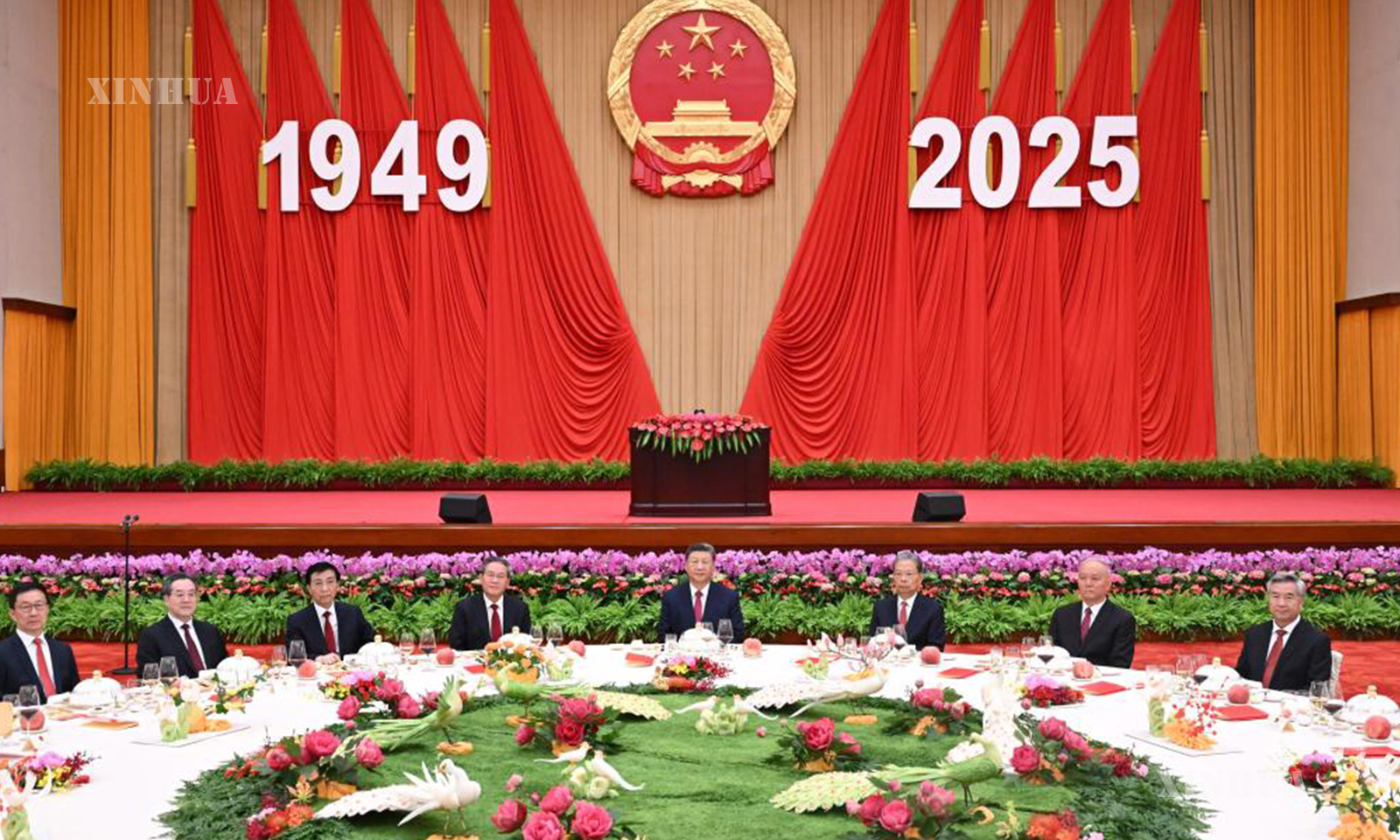 The Communist Party of China and state leaders Xi Jinping, Li Qiang, Zhao Leji, Wang Huning, Cai Qi, Ding Xuexiang, Li Xi and Han Zheng attend a reception to celebrate the 76th anniversary of the founding of the People’s Republic of China along with Chinese and foreign guests at the Great Hall of the People in Beijing, capital of China, Sept. 30, 2025. (Xinhua/Xie Huanchi)