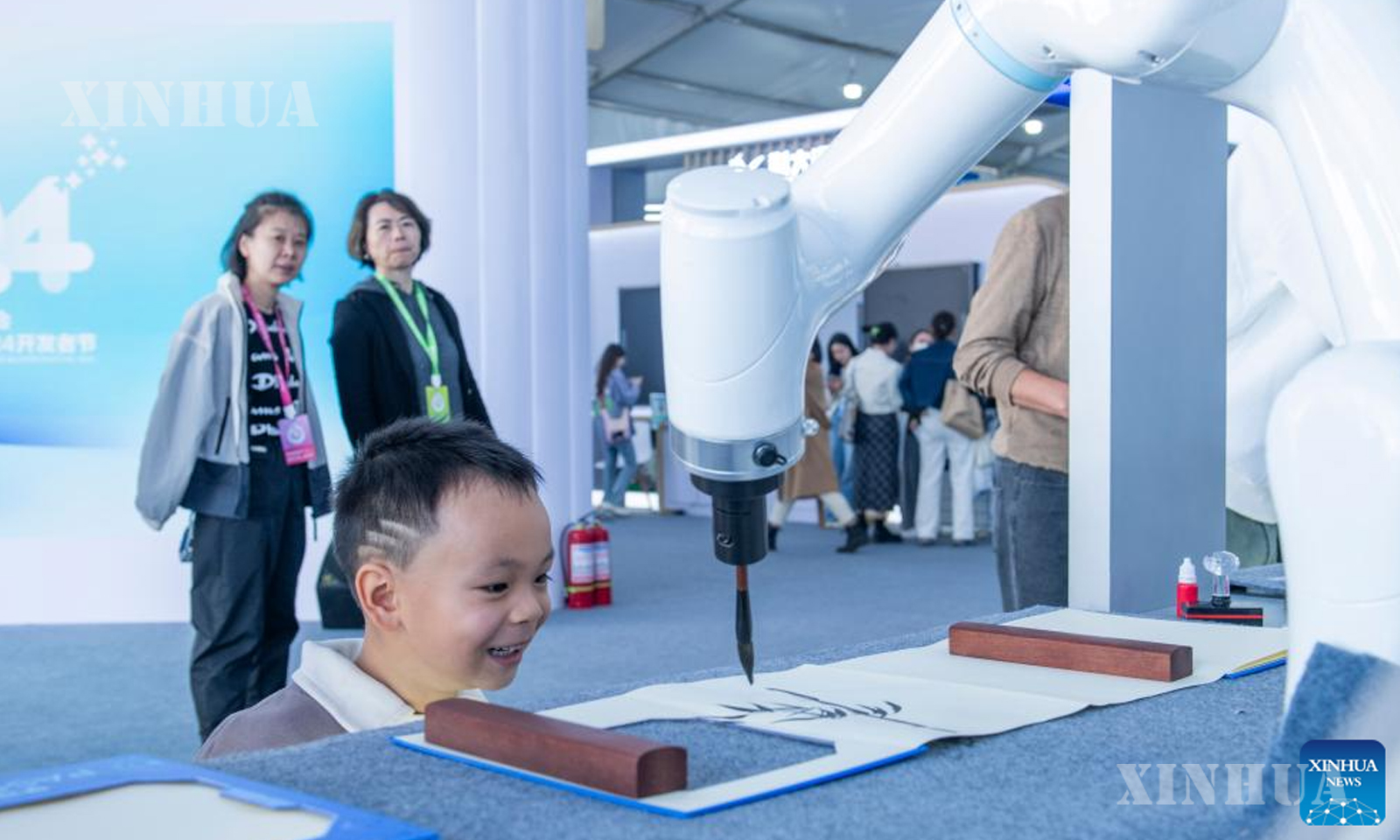 A boy looks at a robotic arm creating traditional Chinese painting at the 7th World Voice Expo in Hefei, east China’s Anhui Province, Oct. 24, 2024. (Xinhua/Fu Tian)