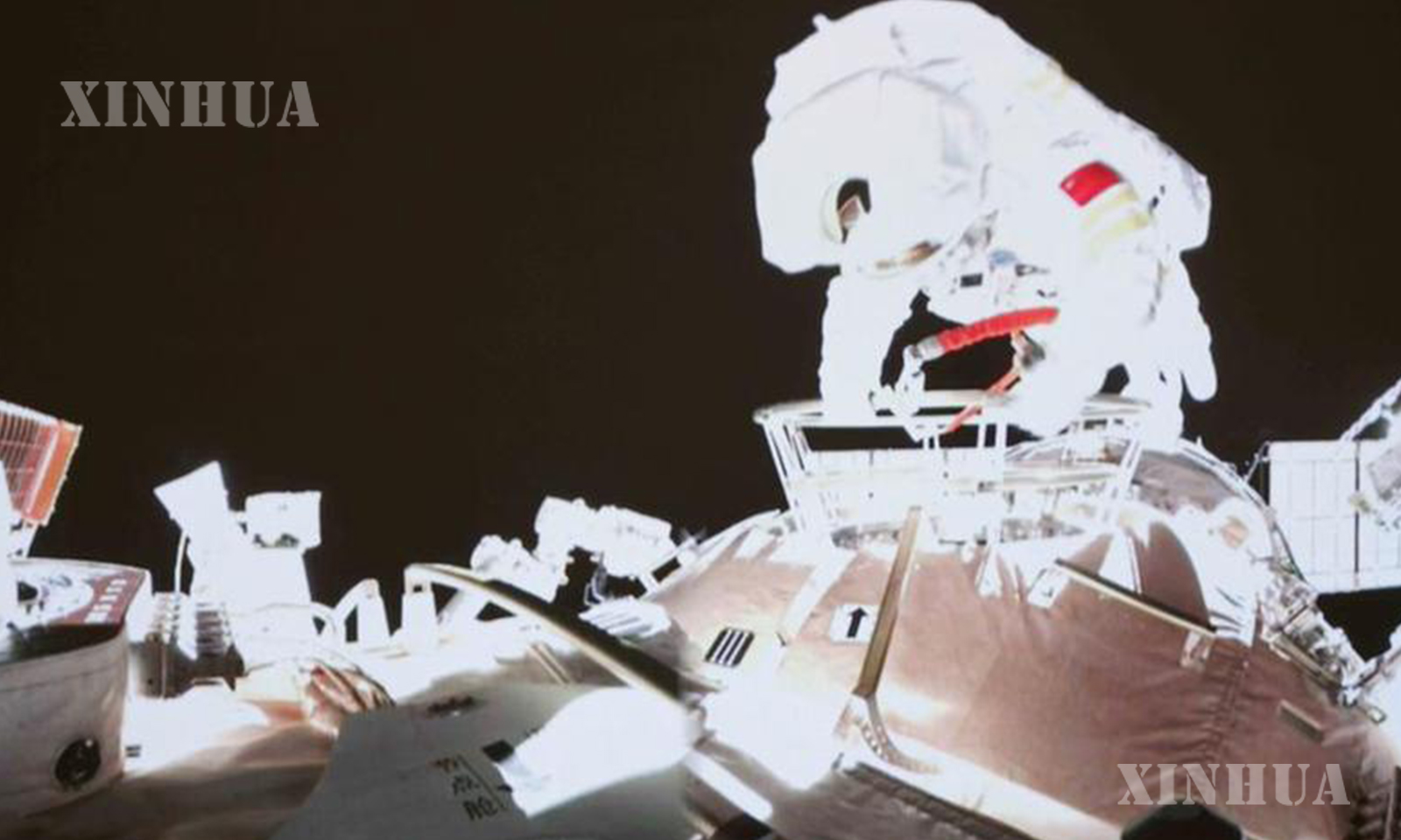 Photo 1: Screen image taken at Beijing Aerospace Control Center on Nov. 7, 2021 shows Chinese taikonaut Wang Yaping conducting extravehicular activities (EVAs) out of the space station core module Tianhe. (Photo by Guo Zhongzheng/Xinhua)