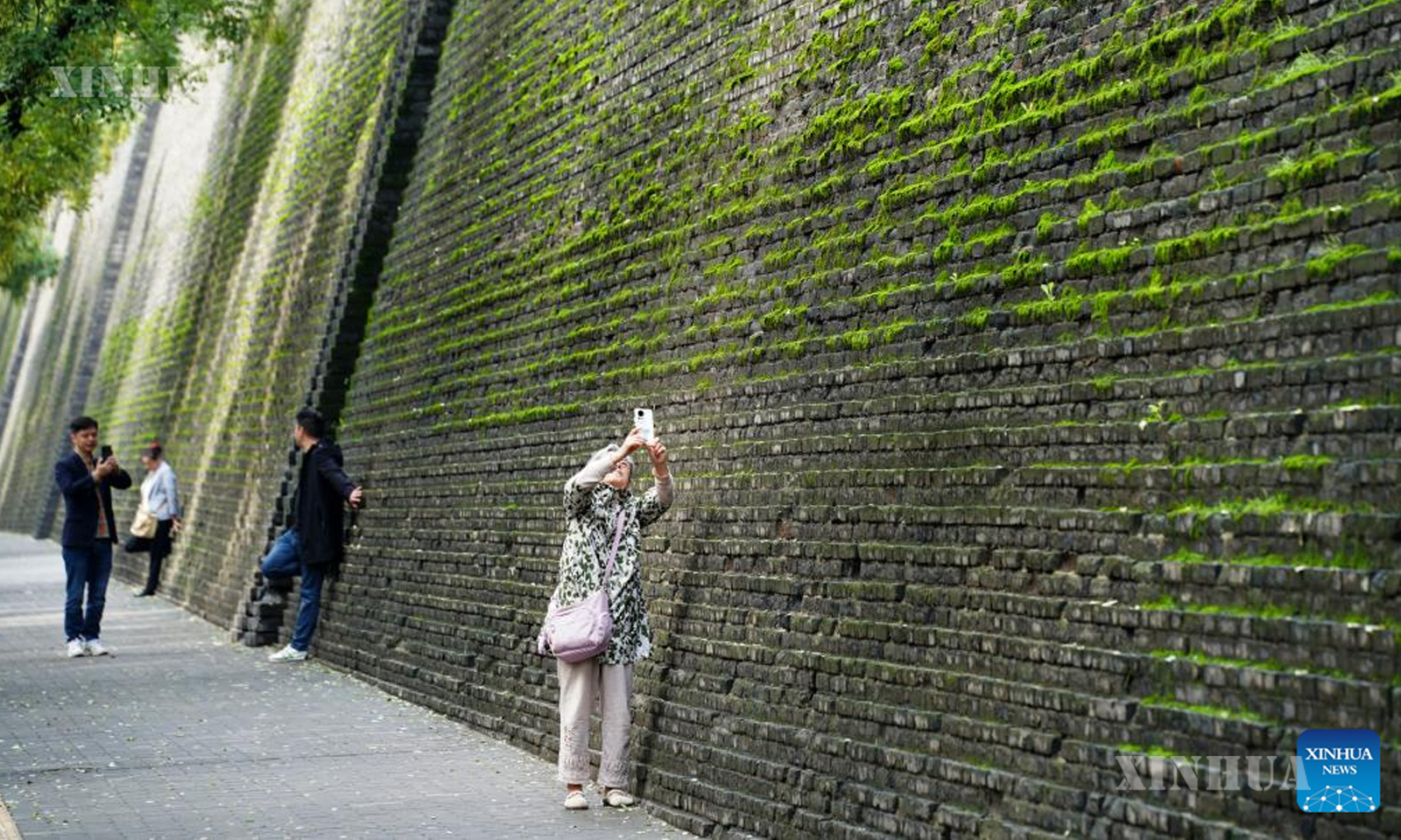 ဆောင်းဦးတွင် မိုးဆက်တိုက်ရွာသွန်းခဲ့ပြီးနောက် ရေညှိနှင့်အခြားသောအပင်များက မြို့ရိုးနံရံကို အစိမ်းရောင်လွှမ်းခြုံထားသဖြင့် လူအများလာရောက်ကြည့်ရှုရန်နှင့် ဓာတ်ပုံရိုက်ကူးရန် ဆွဲဆောင်လျက် ရှိသည်။ (Xinhua)