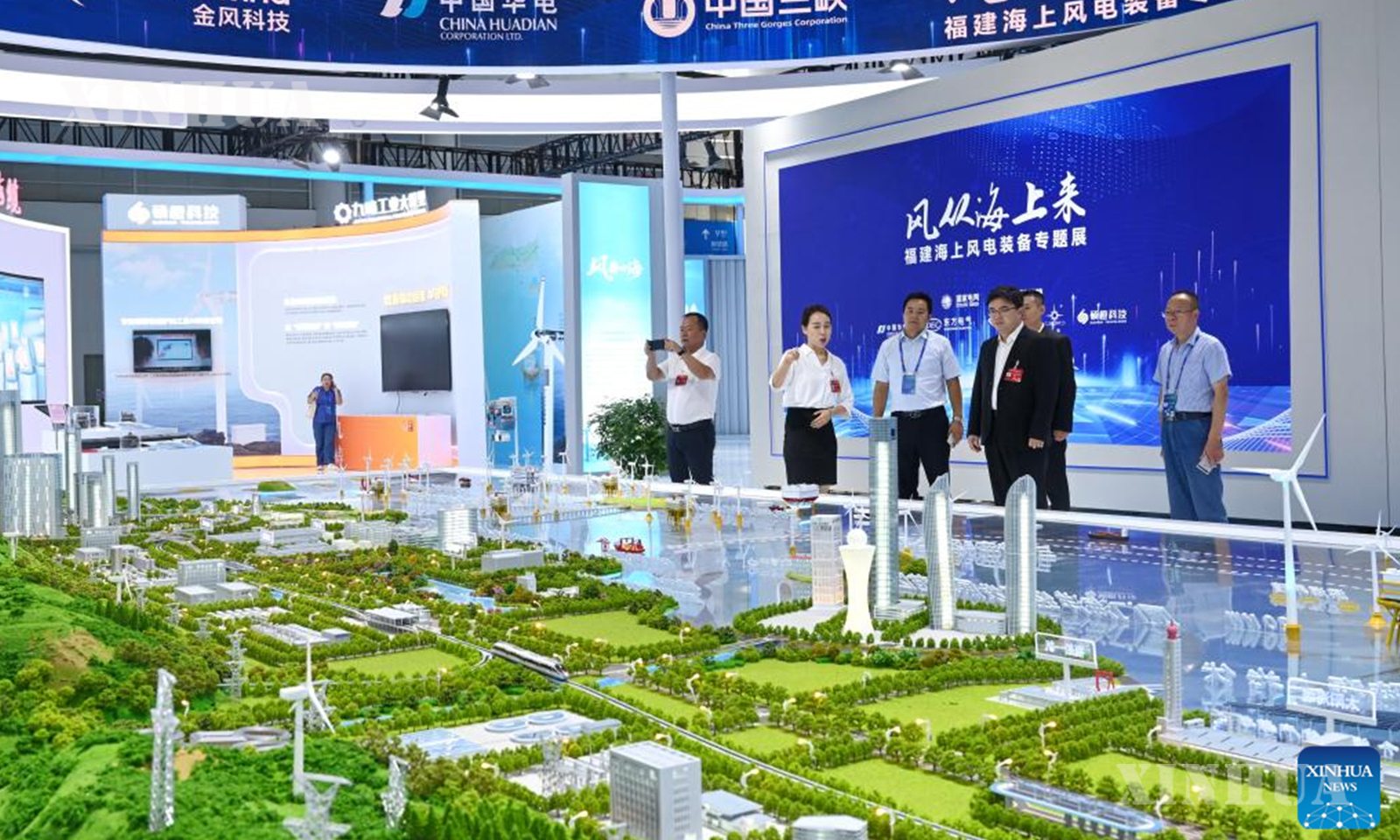 Participants visit an exhibition area of offshore wind power equipment at the World Maritime Equipment Conference 2025 in Fuzhou, southeast China’s Fujian Province, on Oct. 16, 2025. (Xinhua/Zhou Yi)