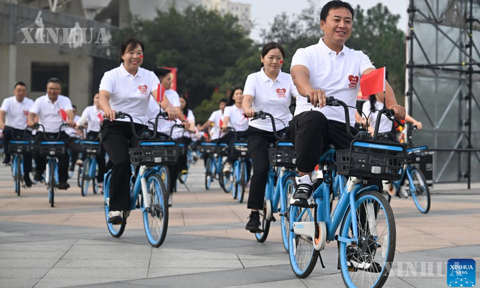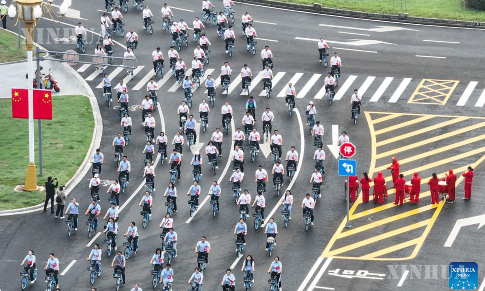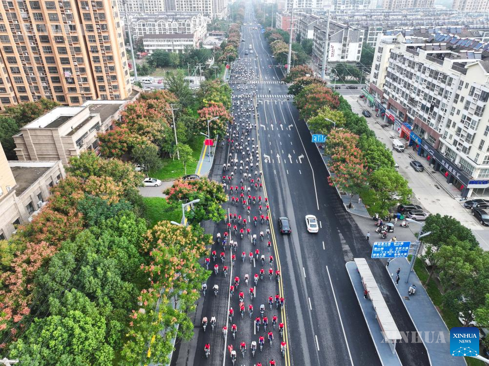 People take part in a bike riding activity in celebration of the 76th anniversary of the founding of the People’s Republic of China in Huaian, east China’s Jiangsu Province, Oct. 1, 2025. (Xinhua/Ji Chunpeng)