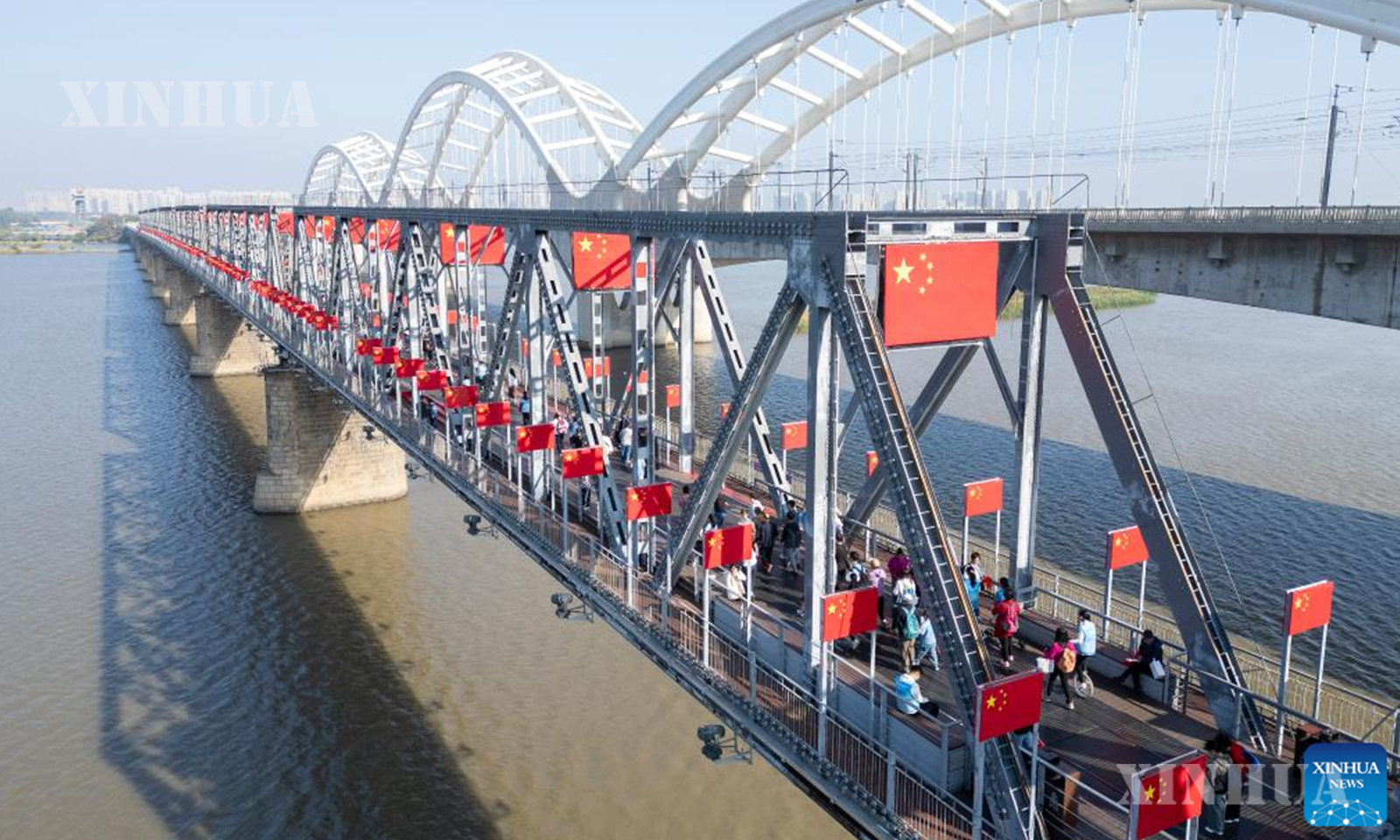 တရုတ်နိုင်ငံ အရှေ့မြောက်ပိုင်း ဟေးလုံကျန်းပြည်နယ် မြို့တော်ဟားအယ်ပင်းမြို့၌ ရထားသံလမ်းတံတားတစ်ခုအဖြစ် အသုံးပြုခဲ့သည့် ခြေကျင်လျှောက်သူများအတွက်နေရာတစ်ခု၌ သွားလာနေကြသူများကို ၂၀၂၅ ခုနှစ် အောက်တိုဘာ ၁ ရက်က တွေ့ရစဉ် (ဆင်ဟွာ)