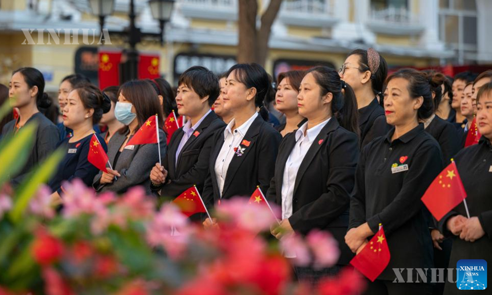 တရုတ်နိုင်ငံ အရှေ့မြောက်ပိုင်း ဟေးလုံကျန်းပြည်နယ် မြို့တော်ဟားအယ်ပင်း၌ အလံတင်အခမ်းအနားသို့ တက်ရောက်လာသူများကို ၂၀၂၅ ခုနှစ် အောက်တိုဘာ ၁ ရက်က တွေ့ရစဉ် (ဆင်ဟွာ)