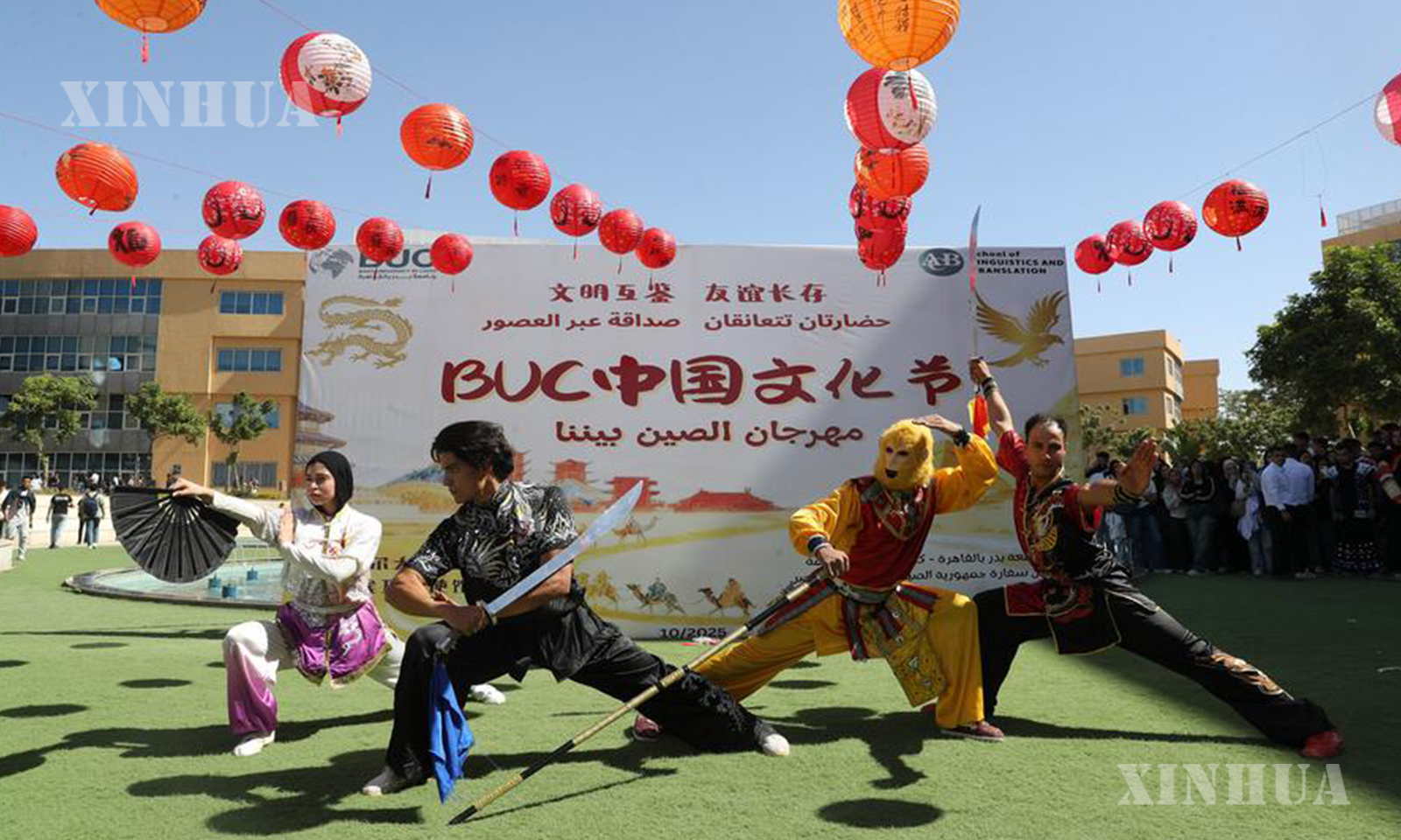 Performers show Chinese martial arts during a Chinese cultural event held at Badr University in Cairo, Cairo Governorate, Egypt, on Oct. 20, 2025. (Xinhua/Sui Xiankai)