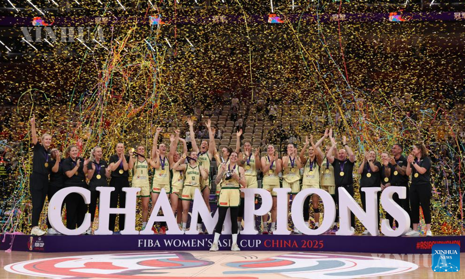 Team Australia celebrate during the awarding ceremony for the final between Australia and Japan at the FIBA Women’s Asia Cup 2025 in Shenzhen, south China’s Guangdong Province, July 20, 2025. (Xinhua/Mao Siqian)
