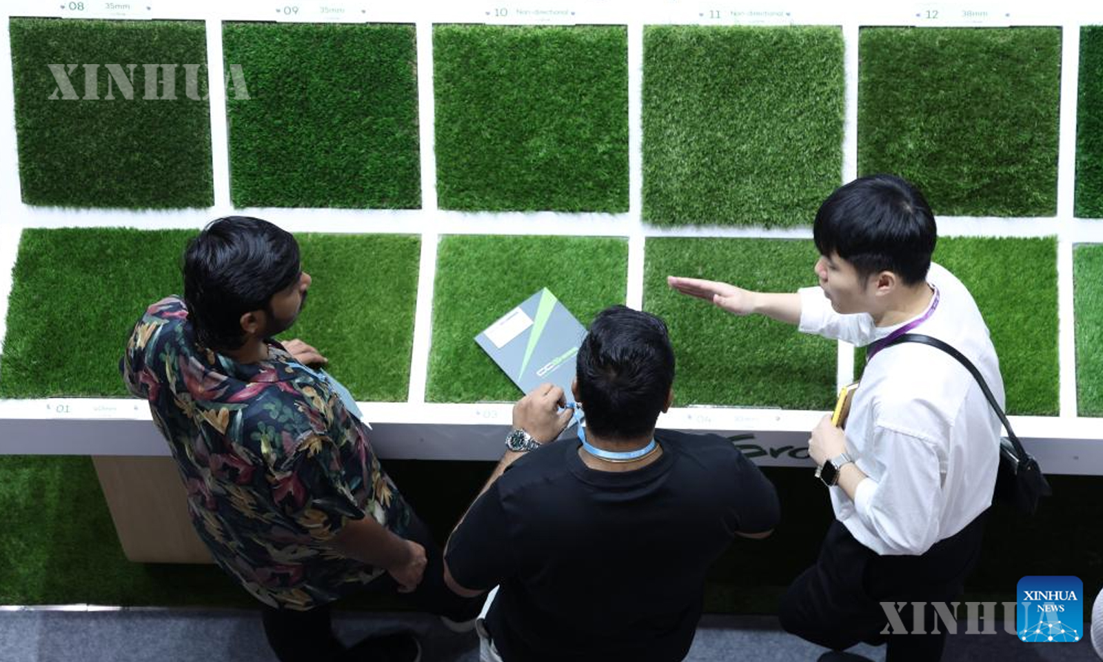 တရုတ်နိုင်ငံတောင်ပိုင်း ကွမ်တုန်းပြည်နယ် ကွမ်ကျိုးမြို့တွင်ကျင်းပသည့် ၁၃၈ ကြိမ်မြောက် ကွမ်ကျိုးကုန်စည်ပြပွဲ (Canton Fair) အတွင်း နိုင်ငံရပ်ခြားမှဝယ်ယူသူများ ပန်းအတုပြခန်းတစ်ခု ကြည့်ရှုနေသည်ကို ၂၀၂၅ ခုနှစ် အောက်တိုဘာ ၂၃ ရက်က တွေ့ရစဥ် (ဆင်ဟွာ)