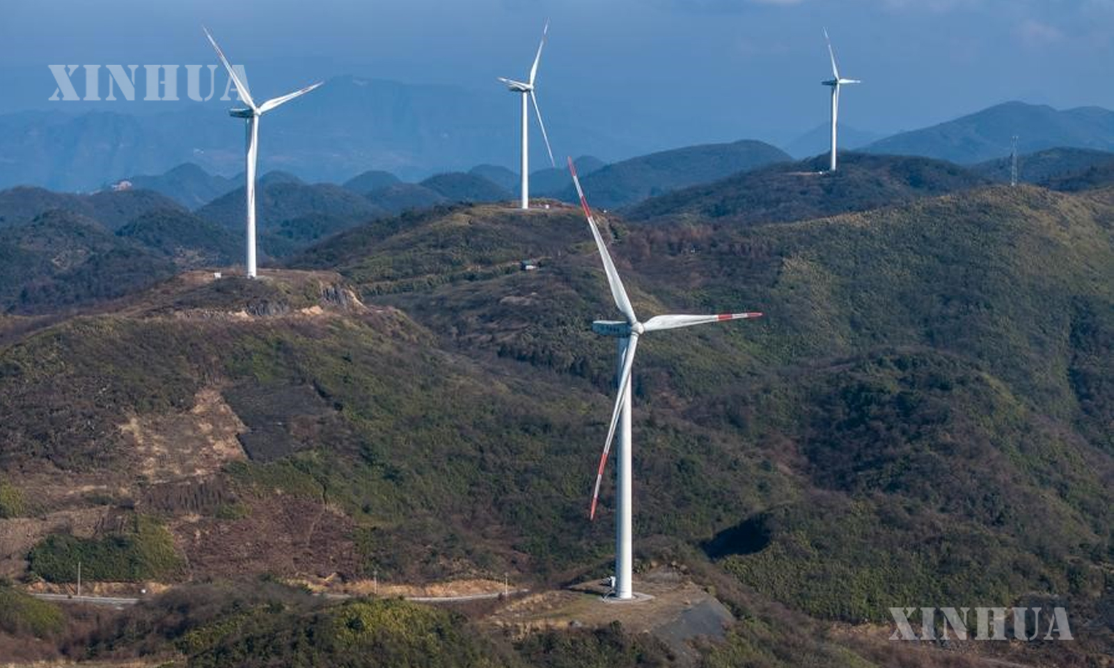 Photo : An aerial drone photo taken on Jan. 10, 2024 shows wind turbines in Liutang Township of Shizhu Tujia Autonomous County, southwest China’s Chongqing. (Xinhua/Huang Wei)