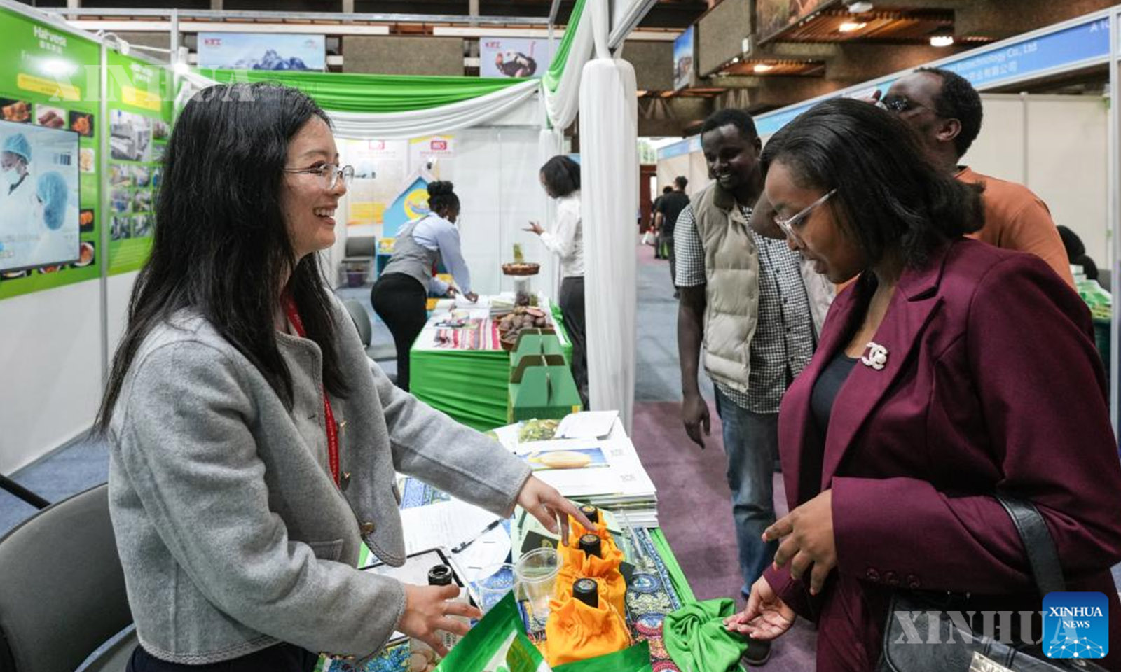 An exhibitor (L) introduces products to visitors during the 2025 Africa International Agricultural Expo in Nairobi, Kenya on Oct. 28, 2025. (Xinhua/Li Yahui)