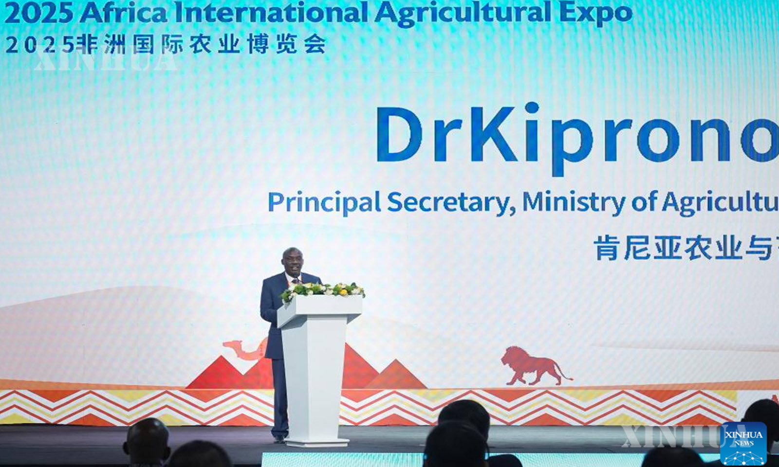 Paul Kipronoh Ronoh, principal secretary in Kenya’s State Department for Agriculture, delivers a speech at the opening ceremony of the 2025 Africa International Agricultural Expo in Nairobi, Kenya on Oct. 28, 2025. (Xinhua/Han Xu)