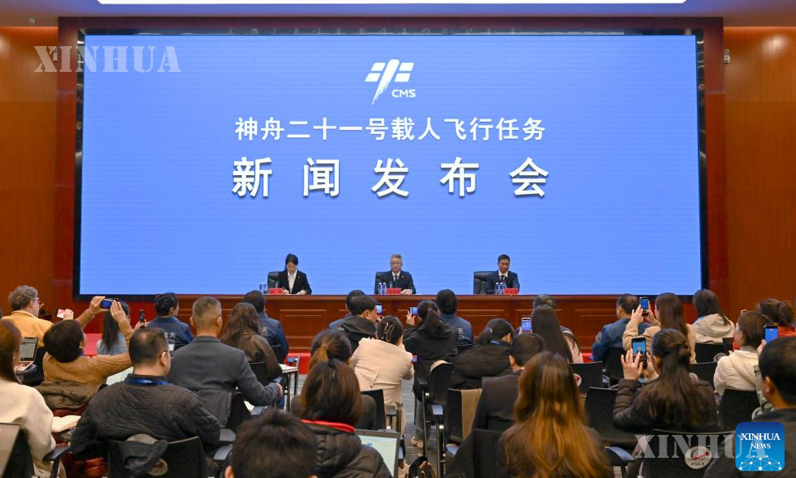 A press conference on the Shenzhou-21 crewed spaceflight mission is held in Jiuquan Satellite Launch Center in northwest China on Oct. 30, 2025. (Xinhua/Li Zhipeng)