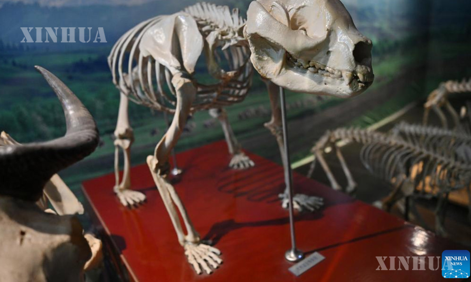 တရုတ်နိုင်ငံ အနောက်မြောက်ပိုင်း ဆန်ရှီးပြည်နယ် ယန်လျင် ခရိုင်ရှိ Northwest A&F တက္ကသိုလ် ပြပွဲပန်းခြံ၏ တိရစ္ဆာန်ပြတိုက်၌ ဧရာမပန်ဒါဝက်ဝံအရိုးစုနမူနာကို ၂၀၂၅ ခုနှစ် အောက်တိုဘာ ၂၆ ရက်က တွေ့ရစဉ် (ဆင်ဟွာ)