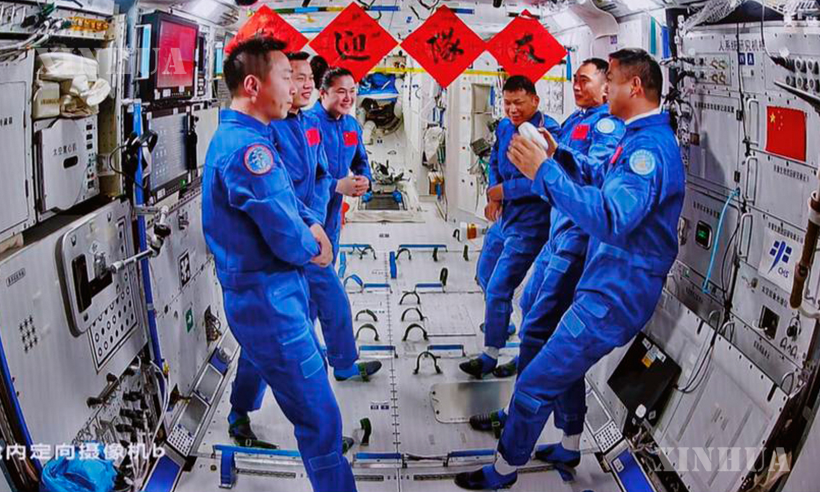 ရှန်ကျိုး-၁၉ နှင့် ရှန်ကျိုး-၂၀ လူတင်အာကာသယာဉ်များမှ အာကာသယာဉ်မှူးများ စကားပြောဆိုနေကြပုံကို ပေကျင်း အာကာသထိန်းချုပ်ရေးစင်တာတွင် ၂၀၂၅ ခုနှစ် ဧပြီ ၂၅ ရက်က ရိုက်ကူးထားသော ဓာတ်ပုံ၌ တွေ့ရစဉ် (ဆင်ဟွာ)